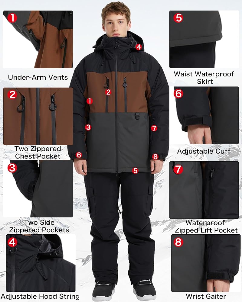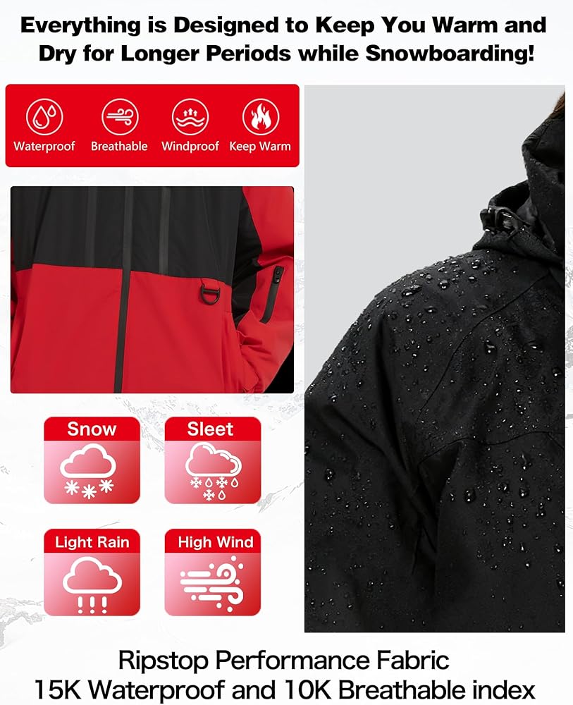 مقاومة للماء وقابلة للتنفس: سترة التزلج مصنوعة من نسيج البوليستر بنسبة 100% مع مؤشر مقاوم للماء 10K وجيد التهوية، مما يضمن قدرتها على تحمل الطقس السيئ مع الحفاظ على درجة حرارة الجسم والرطوبة المريحة أثناء التزلج، نصيحة: مقاس كبير، الرجال يشترون المقاس العادي، النساء شراء حجم أصغر