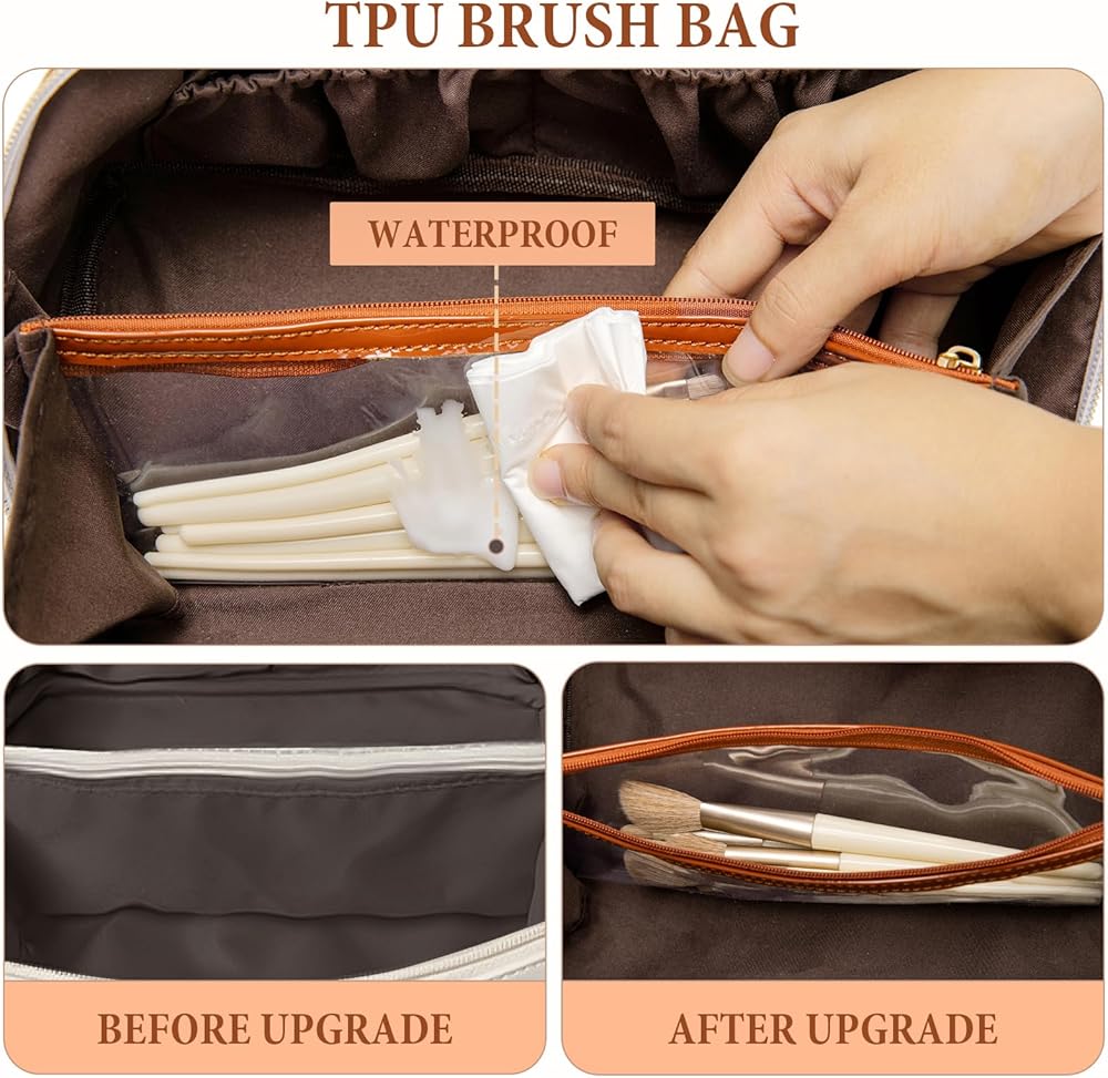 حامل فرشاة محسّن: تحتوي حقيبة أدوات الزينة هذه على حجرة مخصصة للفرشاة للحفاظ على أدواتك منظمة وصحية. مصنوعة من مواد TPU عالية الجودة، وهي تحمي فرشك من التآكل والتشوه، سواء كانت فرشاة كريم أساس أو فرشاة كحل. قم بترقية روتين مكياجك بهذا التصميم المبتكر.