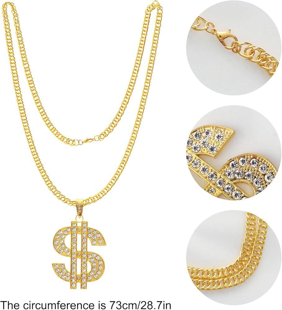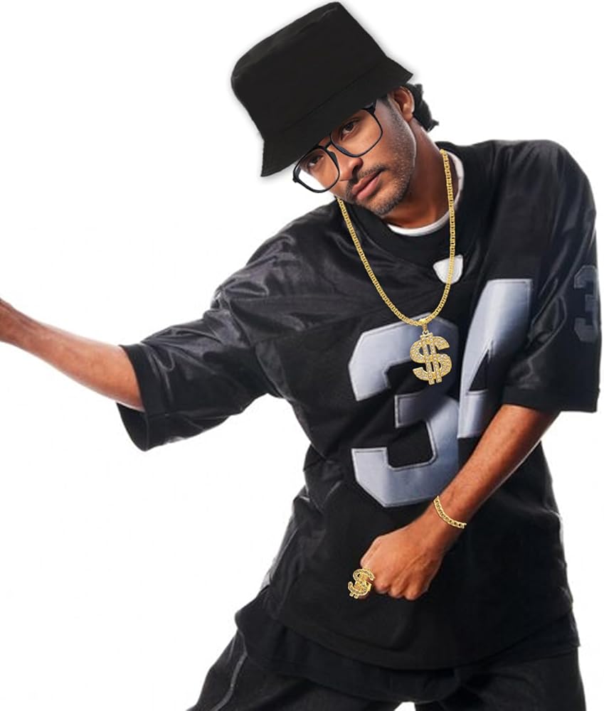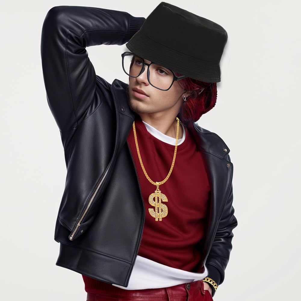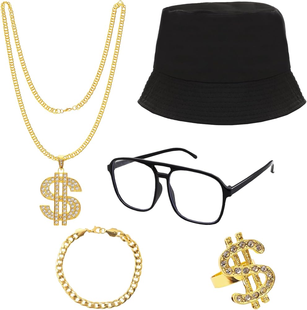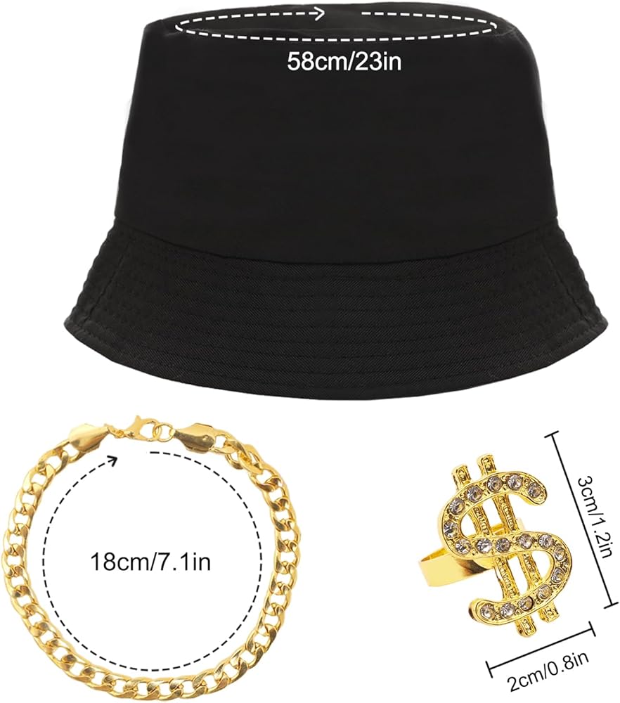 You will receive 1 black bucket hat, 1 rap black frame glasses, 1 gold necklace, 1 dollar sign ring, 1 gold bracelet, simple and fashionable hip-hop costume accessories matching, wear to look personalized, very suitable for 80's 90's themed parties, fully able to meet the requirements of your participation in a variety of parties and daily dressing up, and all are made of reliable and good materials, fine workmanship, not easy to fade and rust, easy and comfortable to wear, bright color, lightweight and portable, can be used repeatedly for a long time.