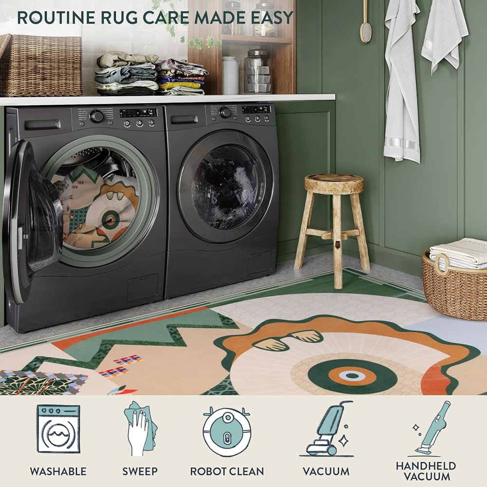 [سجادة سهلة التنظيف] - يوصى بتنظيف البقع والتنظيف الاحترافي. للصيانة اليومية، استخدم منديلًا أو مكنسة كهربائية أو منظفًا آليًا أو مكنسة. نصيحة: للتنظيف العميق، خذ مقاس 8x10/9x12 إلى مغسلة تجارية