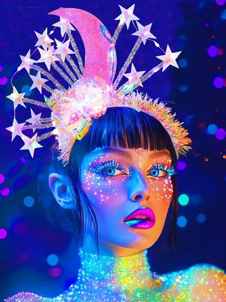عصابة رأس LED على شكل قمر مع تصميم LED تجمع بين عناصر السدم الكونية والنجوم، مما يمنح الناس شعورًا حالمًا ورومانسيًا، ويضيف توهج النجوم إلى الزي أو الزي.