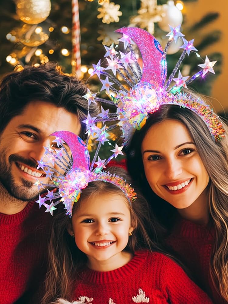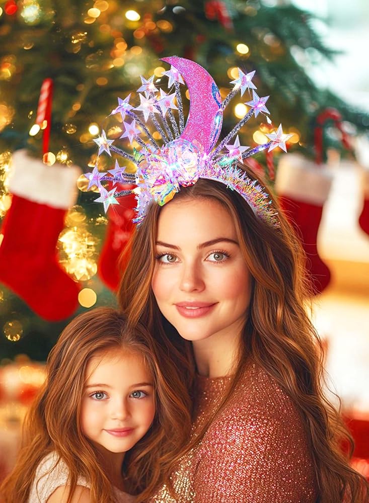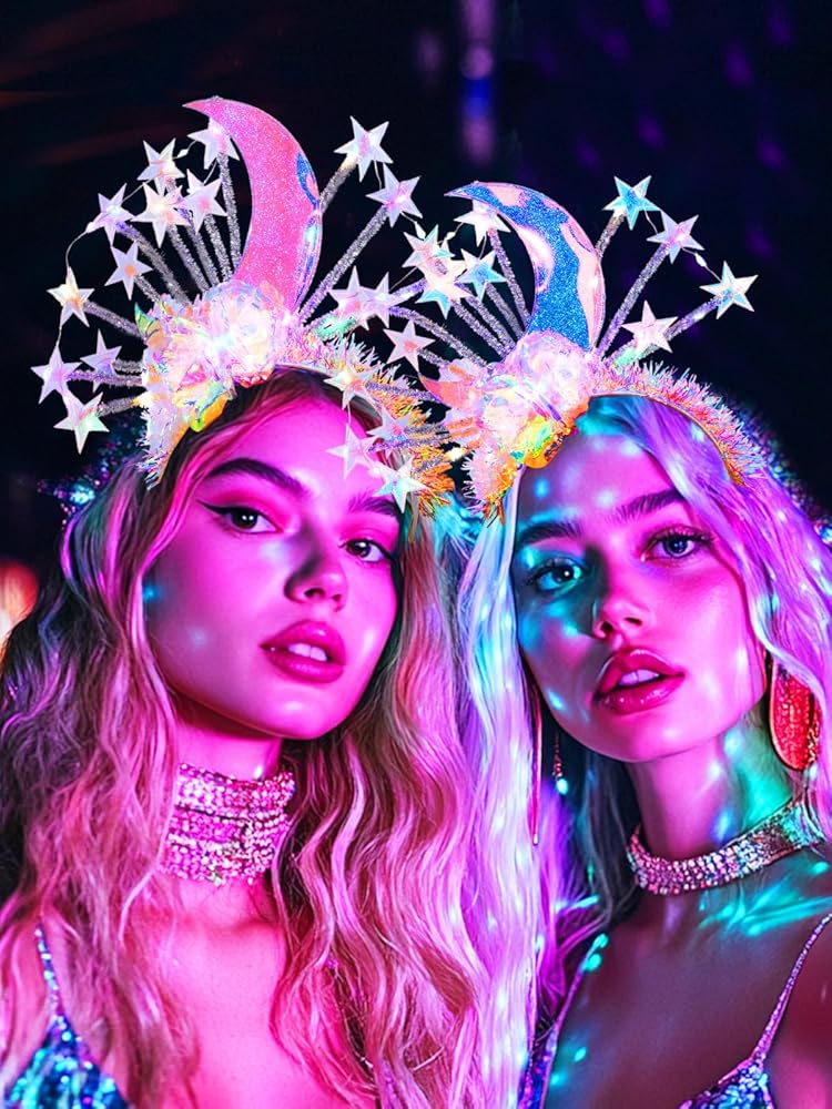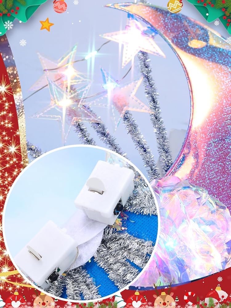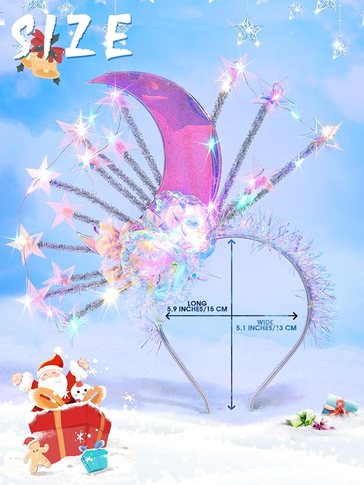 غطاء الرأس المضيء مصنوع من القمر والنجوم وأضواء LED وحلقة شعر بيضاء، وهي آمنة وخفيفة، مما يجعلها مريحة في الارتداء.