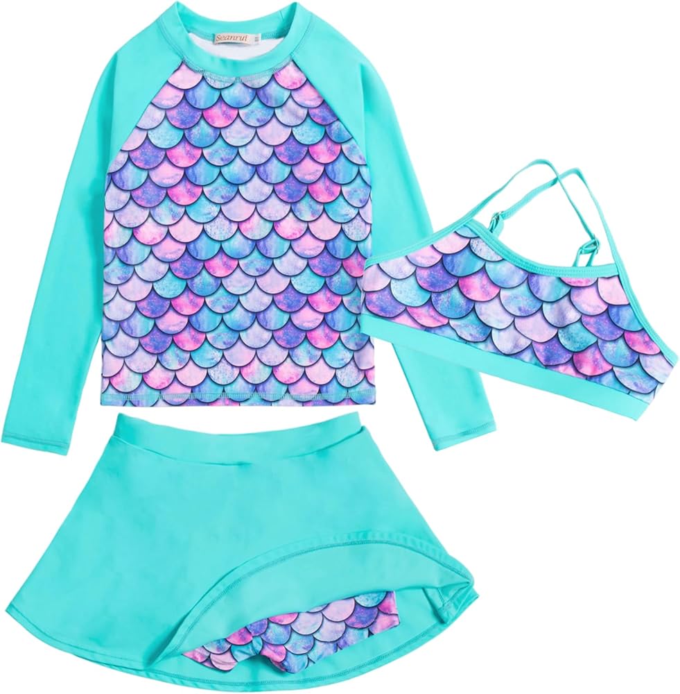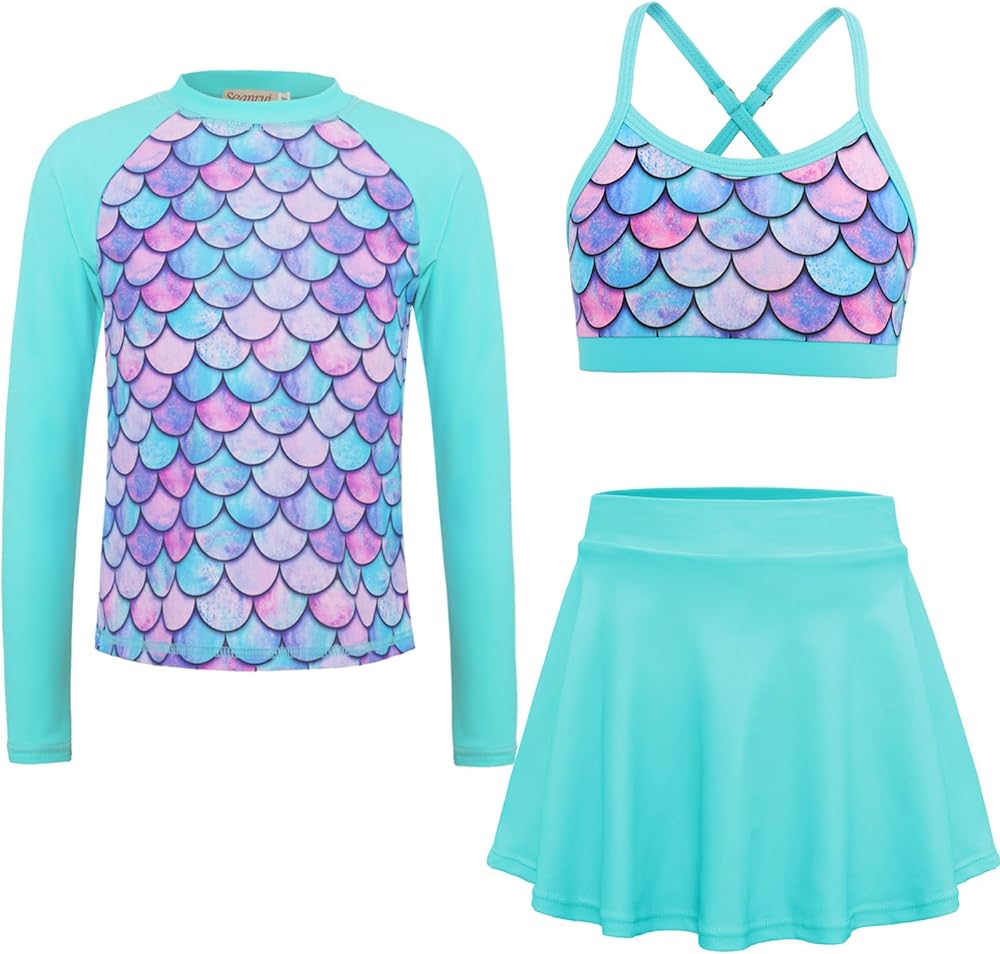 Bright colors girls 3 piece swimsuit: We have mermaid, coconut tree, water ripple patterns and tropical flowers, bright colors, lively and cute. Suitable for girls aged 5 to 14, please refer to the size chart for details