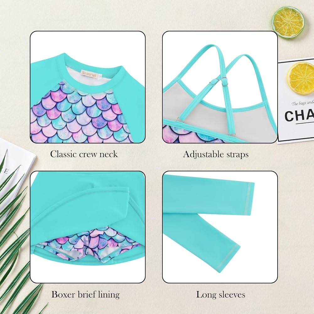 3 Piece girls rash guard: A long sleeve kids swim shirts with sun protection, a bikini top with adjustable straps, and a high waisted swim bottoms (Lining is boxer swim trunks) . Full coverage, flexibility and convenience