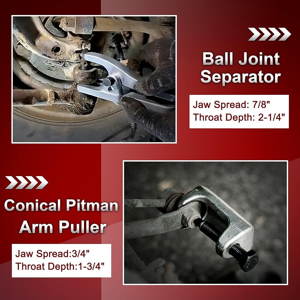 【مجموعة شاملة】 - تتضمن مجموعة الخدمة الأمامية هذه أداة سحب ذراع بيتمان، وفاصل مفصل كروي، وأداة إزالة طرف قضيب الربط لجميع احتياجات صيانة التعليق الخاصة بك في معظم السيارات والشاحنات الخفيفة.