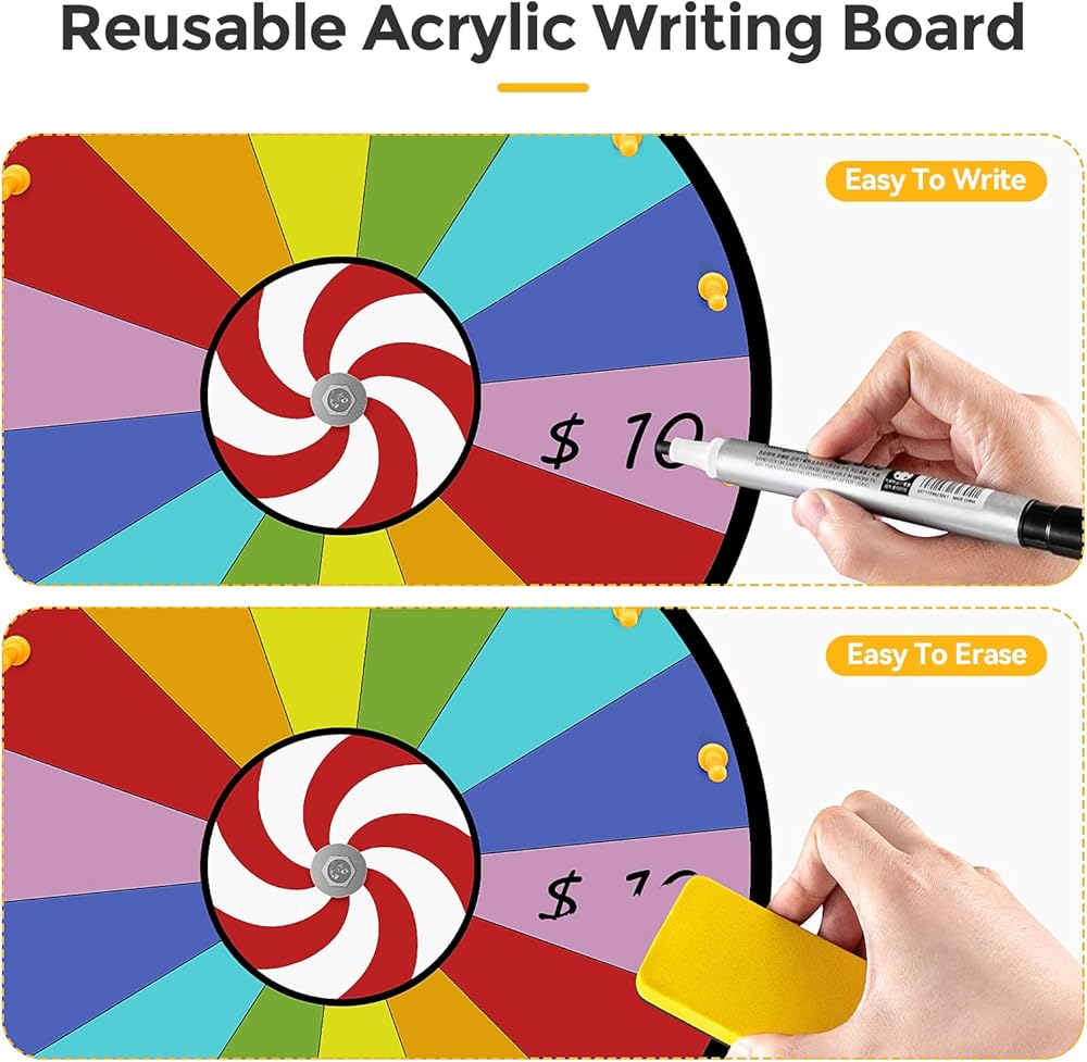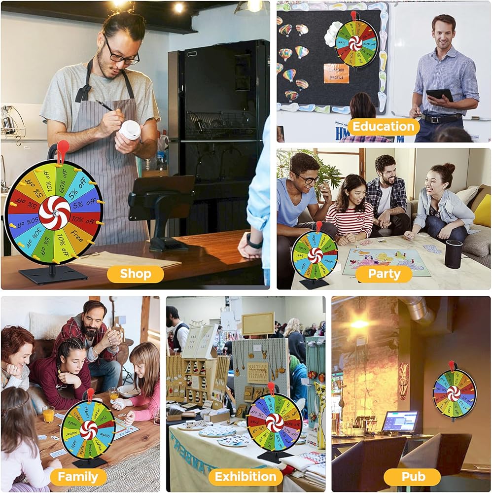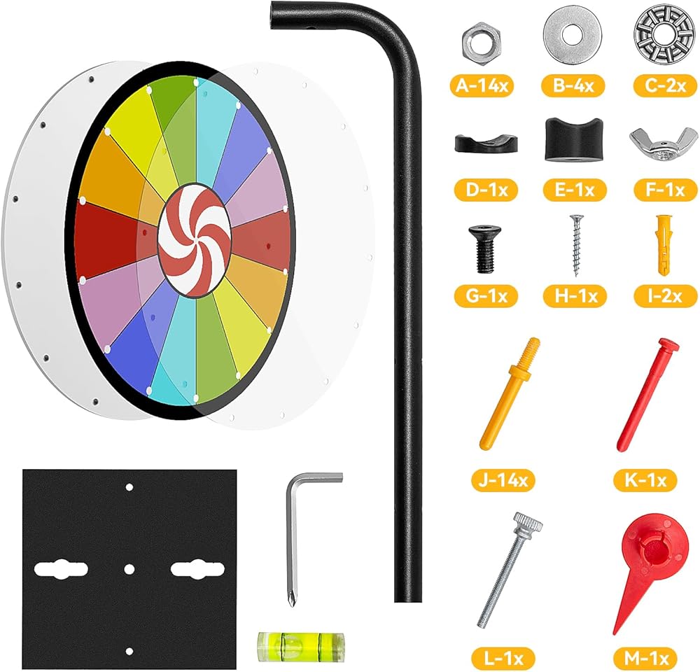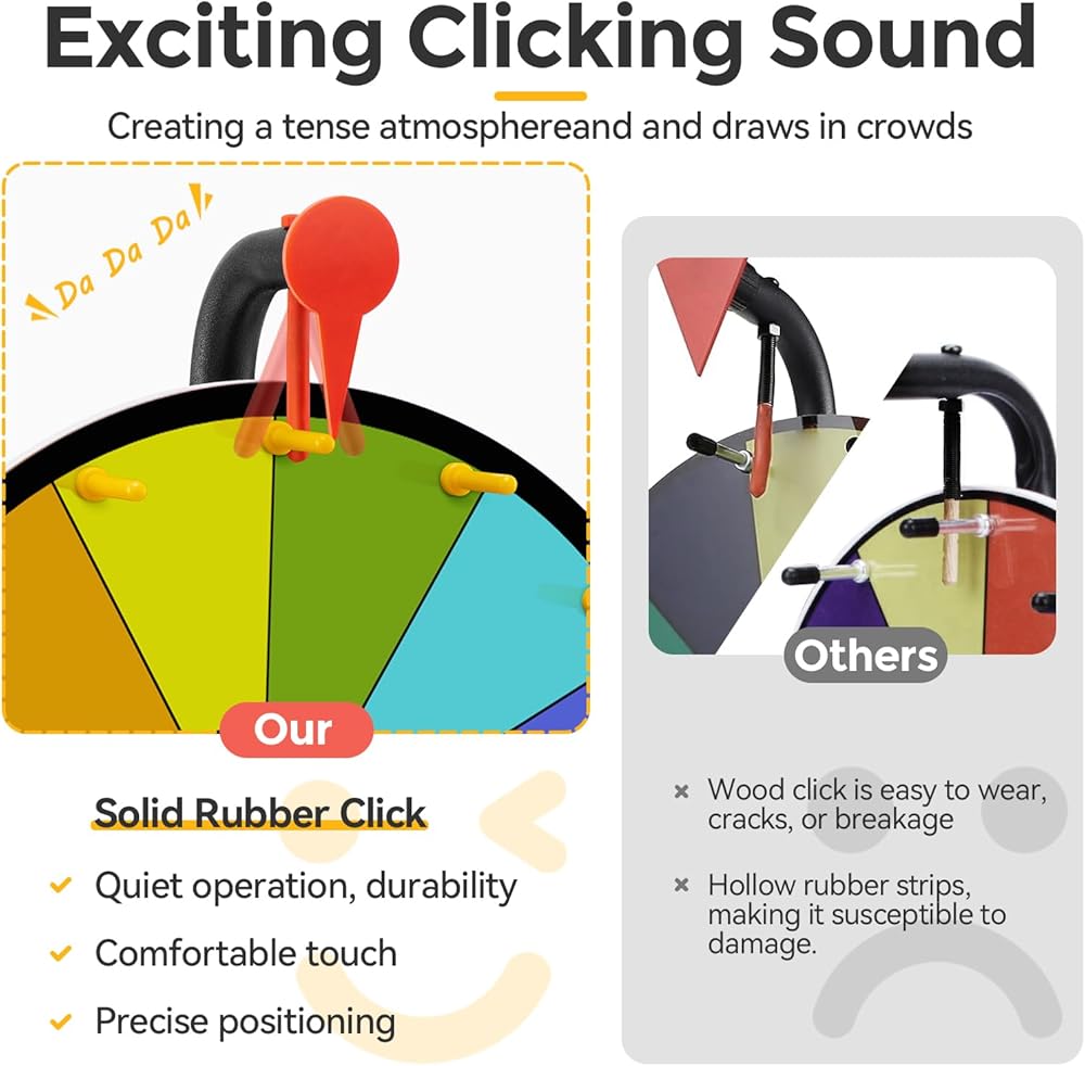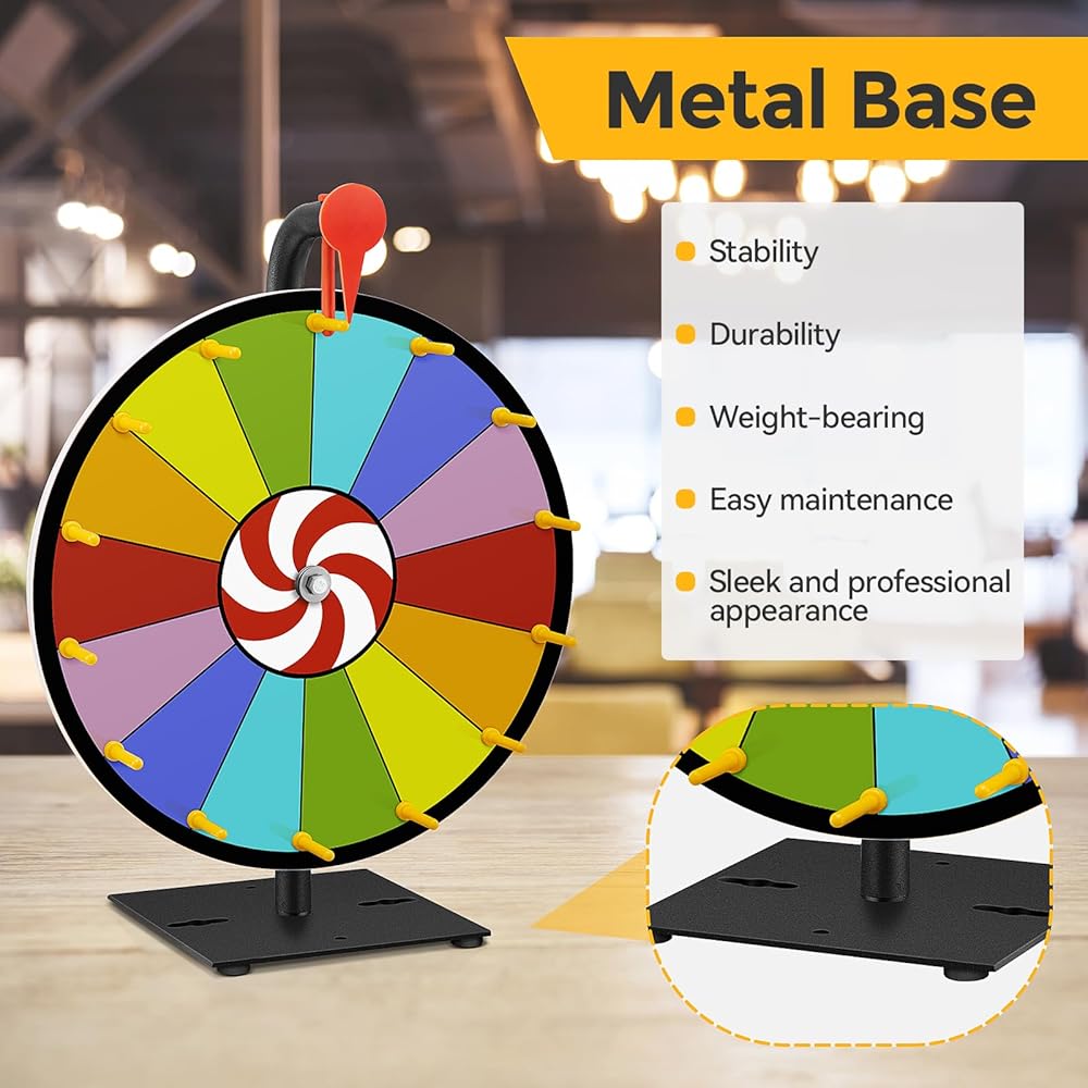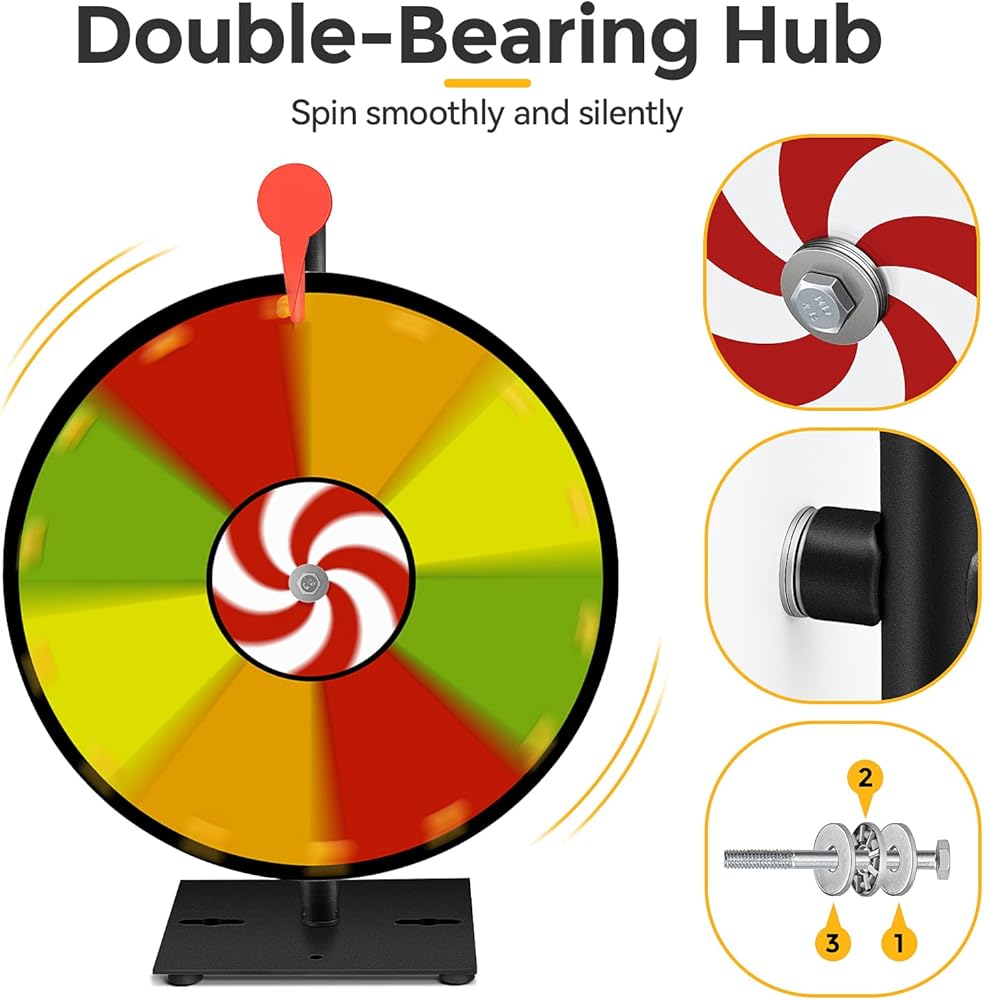 🤡【DOUBLE-BEARING HUB & HEAVY-DUTY METAL BASE】Unlike other single-bearing, we utilize the dual-bearing for our spinning prize wheel. It distributes the load evenly and reduces wobbling during rotation, which enhances stability, durability and service life. It also minimizes the friction and resistance when rotation, allows the prize wheel to spin smoothly and silently, enhancing the overall user experience. The metal base ensures a balanced.