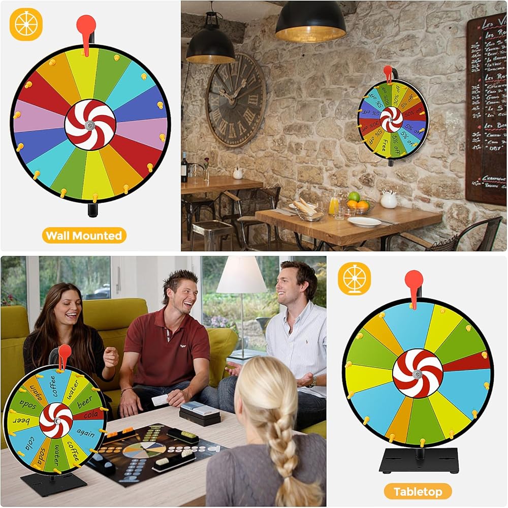 🎯【WALL MOUNTED & TABLETOP USE】ARTISHION 24" spinning prize wheel is designed to dual-use for both wall-mounted and tabletop use. The wall-mounted is perfect for small spaces and take up less floor space. And it can be mounted at eye level, making it easier for people to see and play. The tabletop version is more portable and moved at any time. Suitable for trade shows, carnivals, home parties, classrooms.