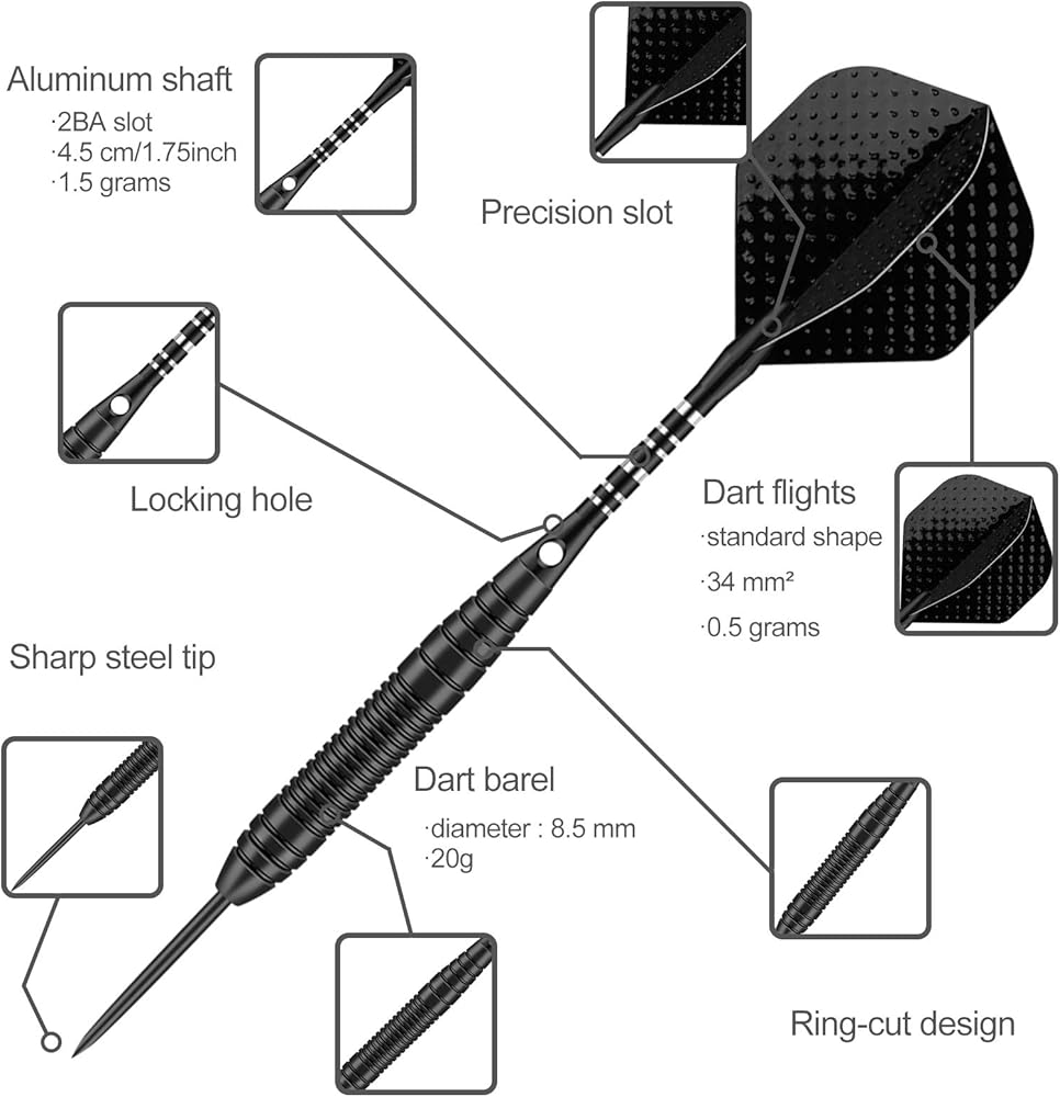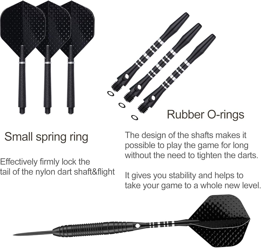 GO TO THE NEXT LEVEL OF YOUR DART GAME ----- Our carefully designed steel darts is equipped with additional accessories, which is very suitable for beginners and intermediate players. The straight and streamlined design of the dart barrel with grip enhancing grooves provides excellent weight balance,best control, all these things help you hit the darts with right precision;