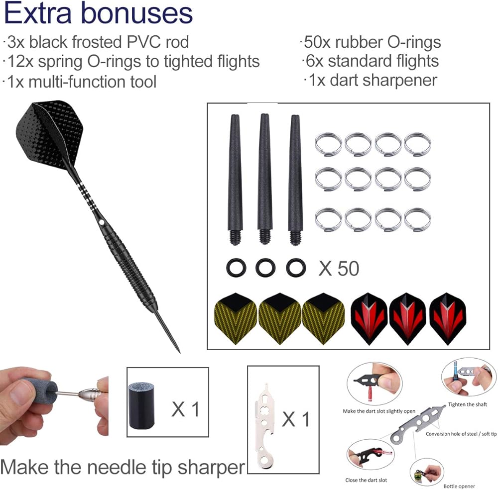 Each set includes 3 darts, extra 3 nylon shafts + 9 flights + 50 rubber O-rings + 1 Dart tool + 1 dart sharpener + 1 black case