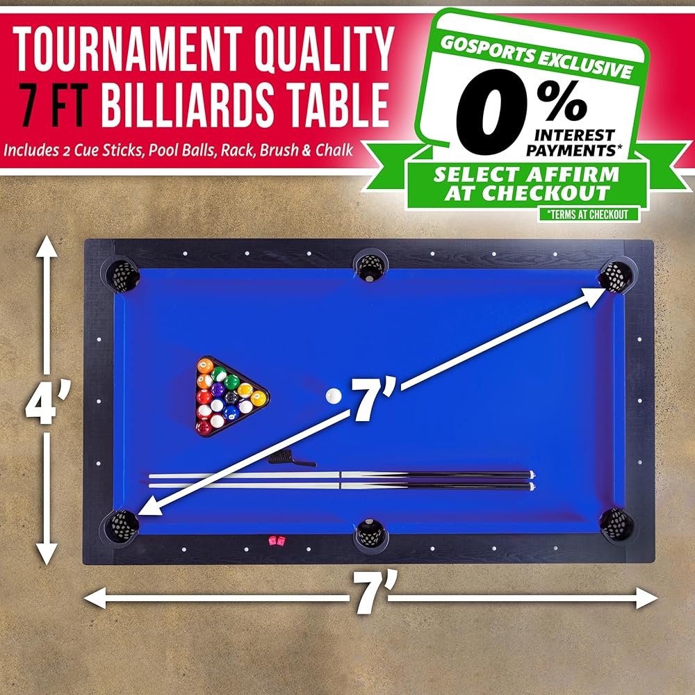 7 FT BILLIARDS TABLE: Heavy-duty, mid-size pool table measures 7ft x 4 ft x 2.7 ft; Full set includes 7 ft table, 2 (57 in.) cue sticks, 15 regulation pool balls and cue ball, ball rack, felt brush and chalk