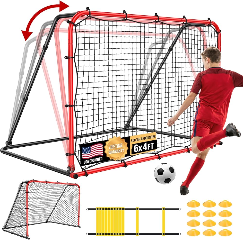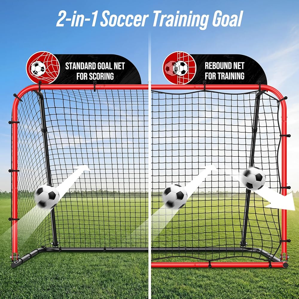 4-in-1 Soccer Rebounder & Goal: Our soccer goal system includes 3 training nets (top, side, and rebounder nets) and a standard soccer goal net for backyard games. The heavy-duty metal frame with an I-beam structure ensures stability and durability