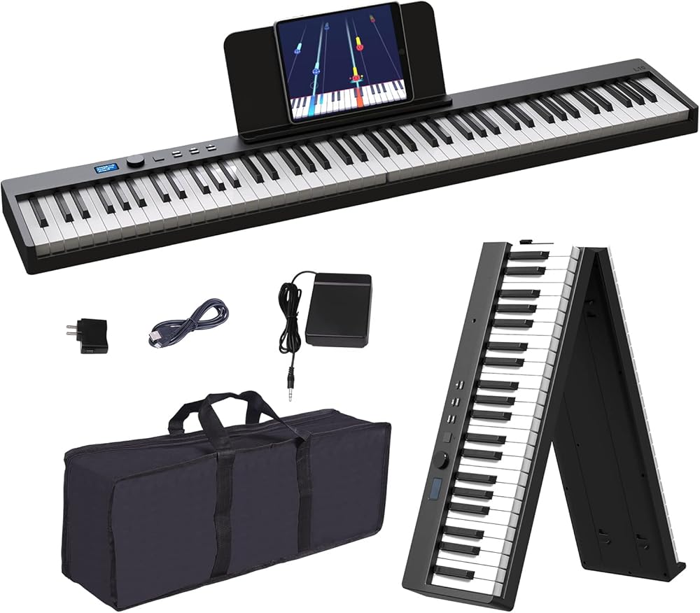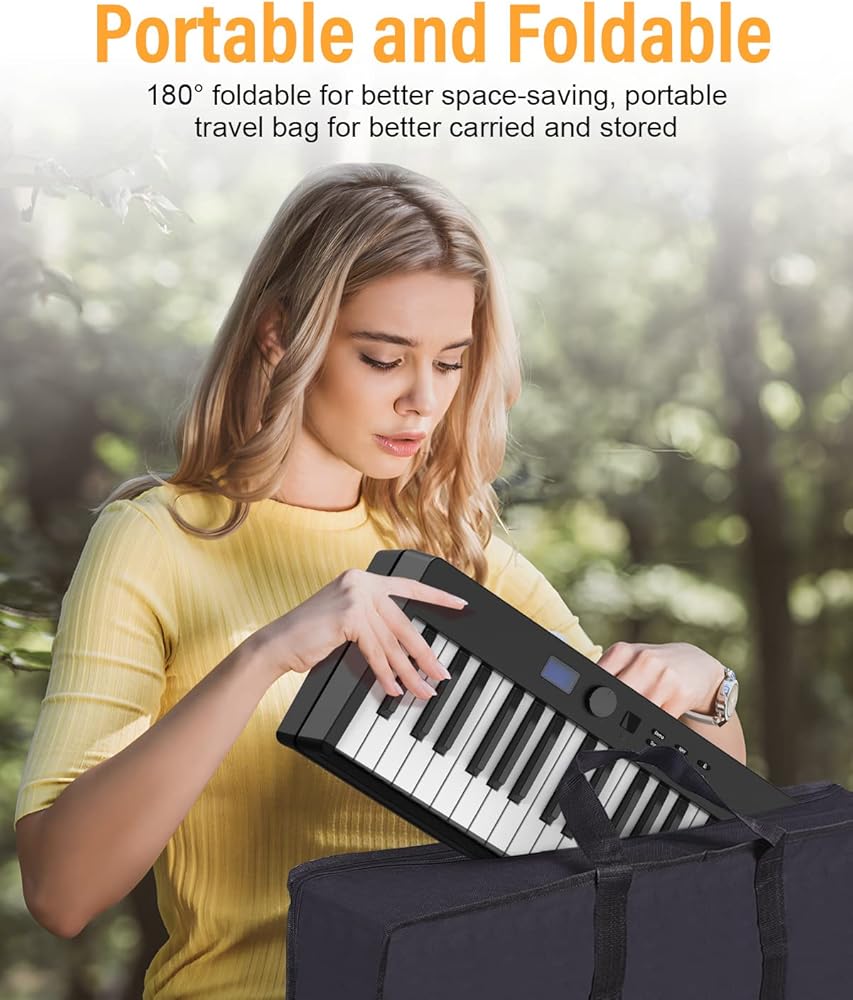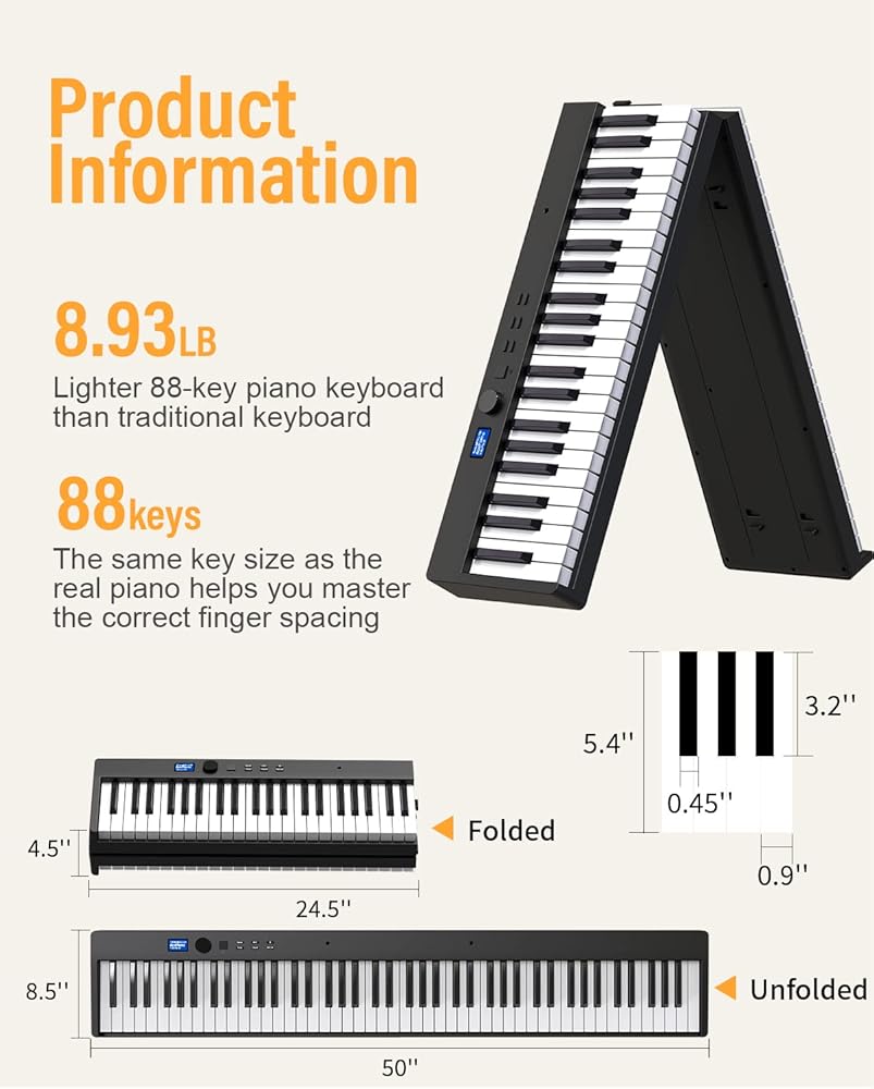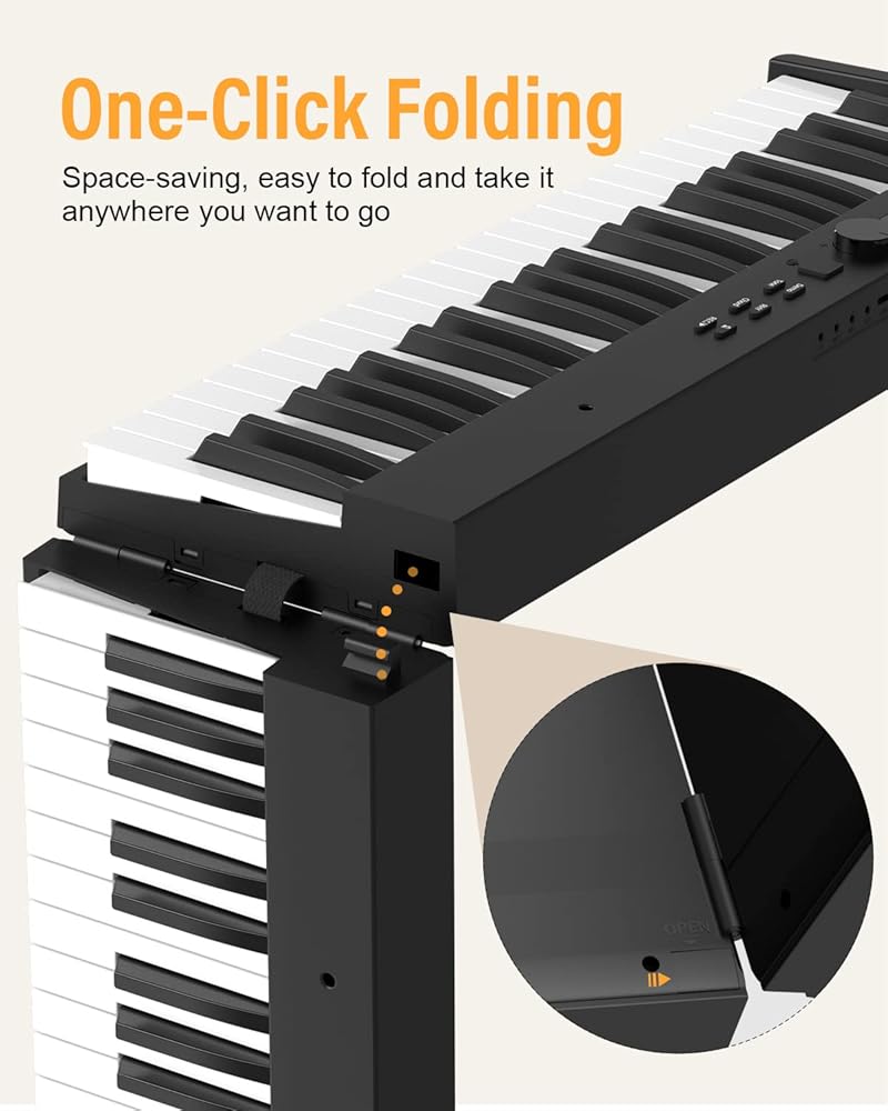 【بيانو محمول وقابل للطي】يمكن طي البيانو القابل للطي بزاوية 180 درجة، مما يوفر مساحة كبيرة وسهل الحمل. تأتي لوحة مفاتيح البيانو القابلة للطي مع حقيبة سفر محمولة يمكن حمايتها وتخزينها بشكل جيد. يبلغ حجم البيانو المطوي للوحة المفاتيح القابلة للطي 24.8 × 8 × 4.7، ويزن 9.6 رطل فقط. يمكنك أخذها إلى أي مكان وفي أي وقت تريده، واستمتع بالموسيقى مع العائلة أو الأصدقاء.