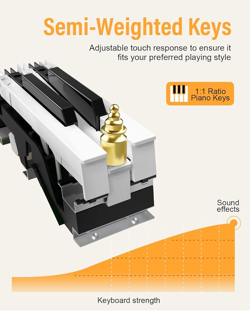 【لوحة مفاتيح بيانو كاملة الحجم وشبه مرجحة】تم تصميم مفاتيح البيانو المحمولة هذه وفقًا لمفتاح البيانو بنسبة 1:1، مما يوفر لك لمسة إصبع مماثلة وعمق مفتاح البيانو. تحتوي لوحة المفاتيح المكونة من 88 مفتاحًا على 88 مفتاحًا شبه مرجح، ويعتمد حجم لوحة المفاتيح على مدى قوة الضغط على المفاتيح. يمكن للبيانو الرقمي من خلال قوة المفاتيح المختلفة الحصول على تغيير رائع للجرس، ويعرض ديناميكية الموسيقى الحقيقية، وتشغيل الموسيقى أكثر ثراءً وحساسة، ويدعم وظيفة لوحة المفاتيح المزدوجة.
