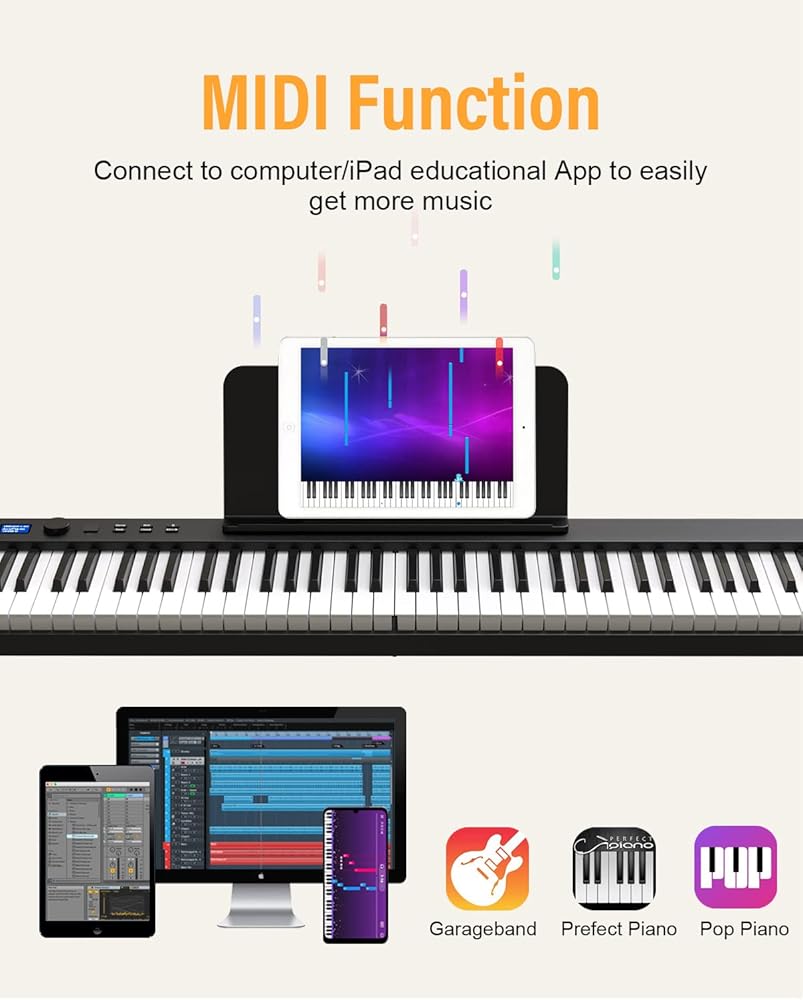 【لوحة مفاتيح بلوتوث وMIDI】لوحة مفاتيح البيانو المكونة من 88 مفتاحًا مدمجة في اتصال لاسلكي. استخدم البلوتوث للاتصال لاسلكيًا بتطبيقات ألعاب البيانو مثل Garage Band وPerfect Piano وPop Piano أو دروس الموسيقى عبر الإنترنت، مما يجعل تعلم العزف على البيانو أكثر متعة. تتيح لك واجهة MIDI/USB للوحة مفاتيح البيانو الكهربائية توصيل الكمبيوتر والأجهزة الذكية الأخرى لتحرير الموسيقى وإنشاء الموسيقى الخاصة بك.