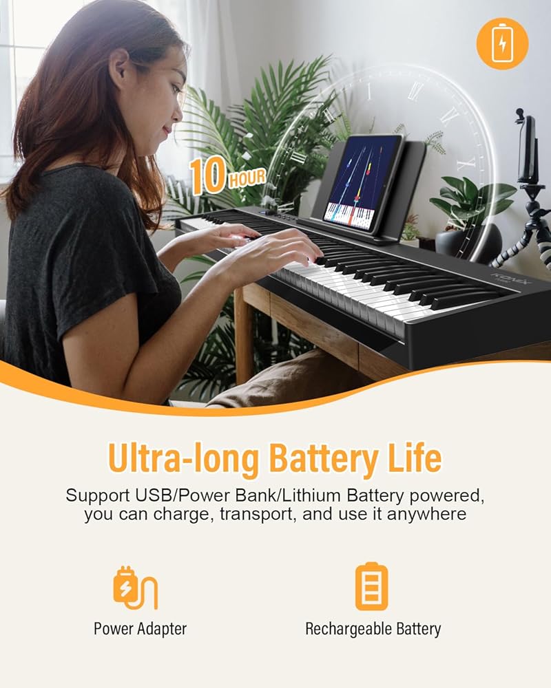 【لوحة مفاتيح بيانو مثالية مكونة من 88 مفتاحًا】يحتوي بيانو لوحة المفاتيح للمبتدئين على بطارية ليثيوم مدمجة قابلة لإعادة الشحن، وتدعم شحن USB، وشحن بنك الطاقة، وتعمل ببطارية الليثيوم، ووقت تشغيل 6-8 ساعات لكل شحن كامل. لا داعي للقلق من عدم وجود طاقة كافية عند ممارسة البيانو أثناء السفر أو في الهواء الطلق أو في المدرسة أو في العرض وما إلى ذلك.