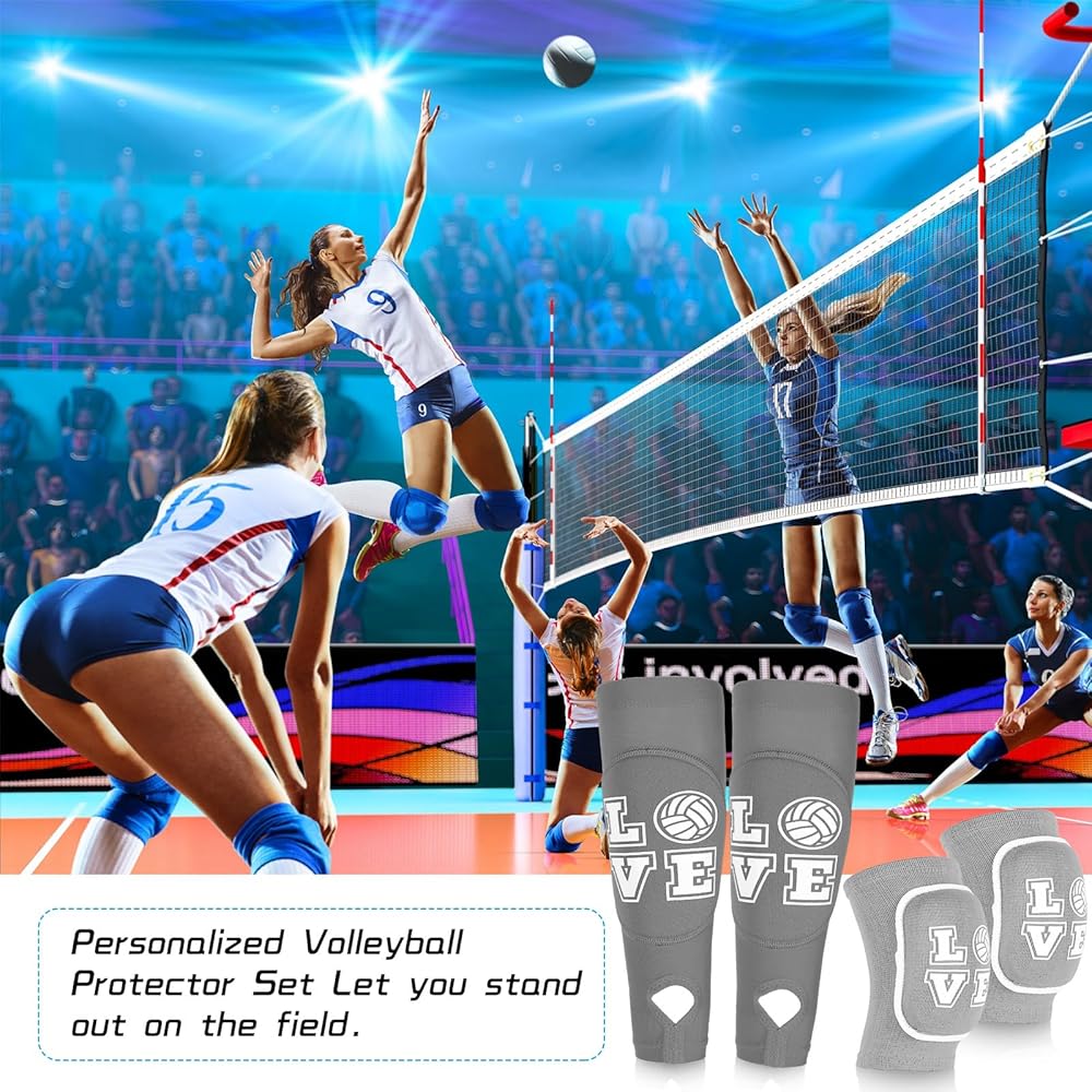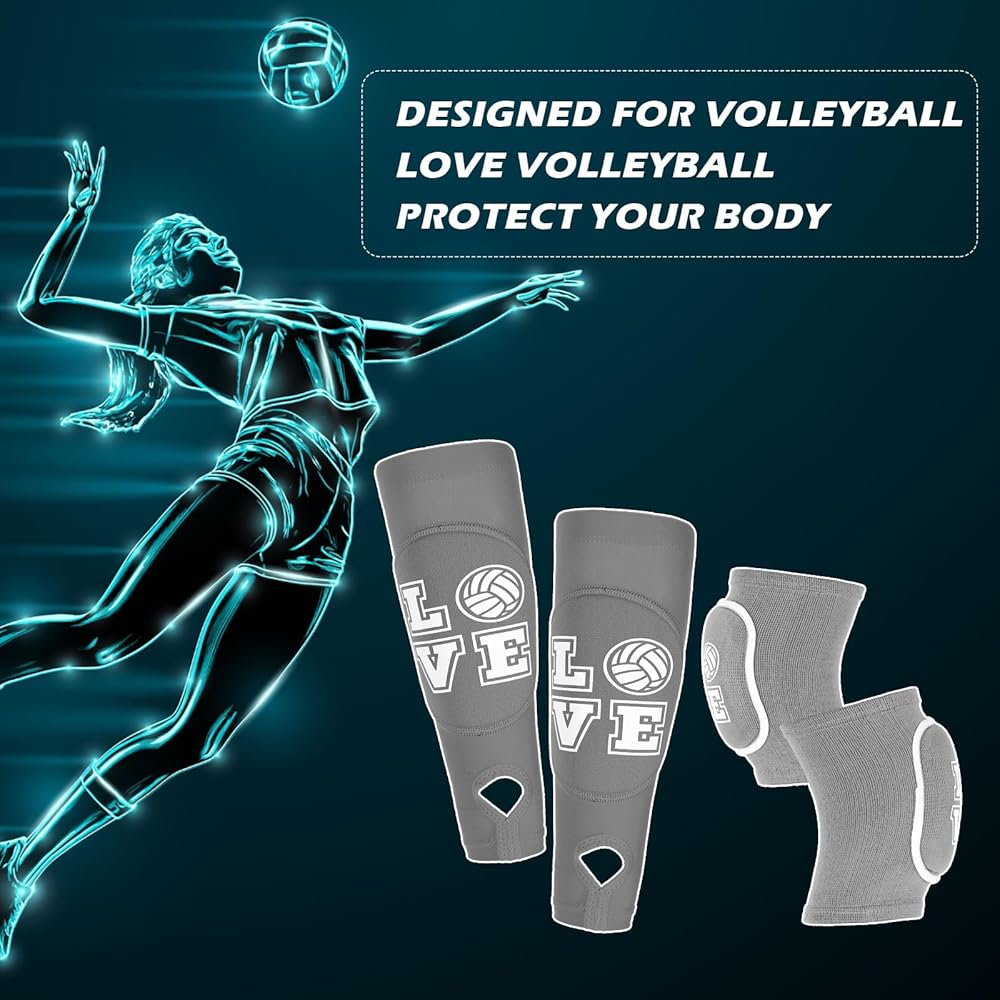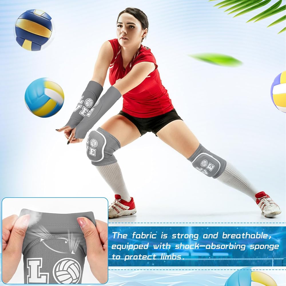ramede Volleyball Knee Pads and Volleyball Arm Sleeves with Protection Pad Forearm Elbow Sleeve with Thumb Hole Volleyball Accessories Gear for Girls Women (2 Pairs,Gray,Volleyball)