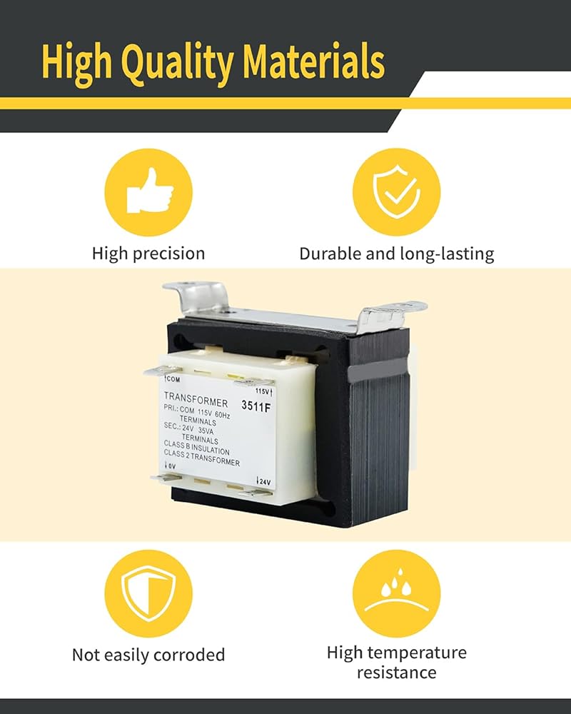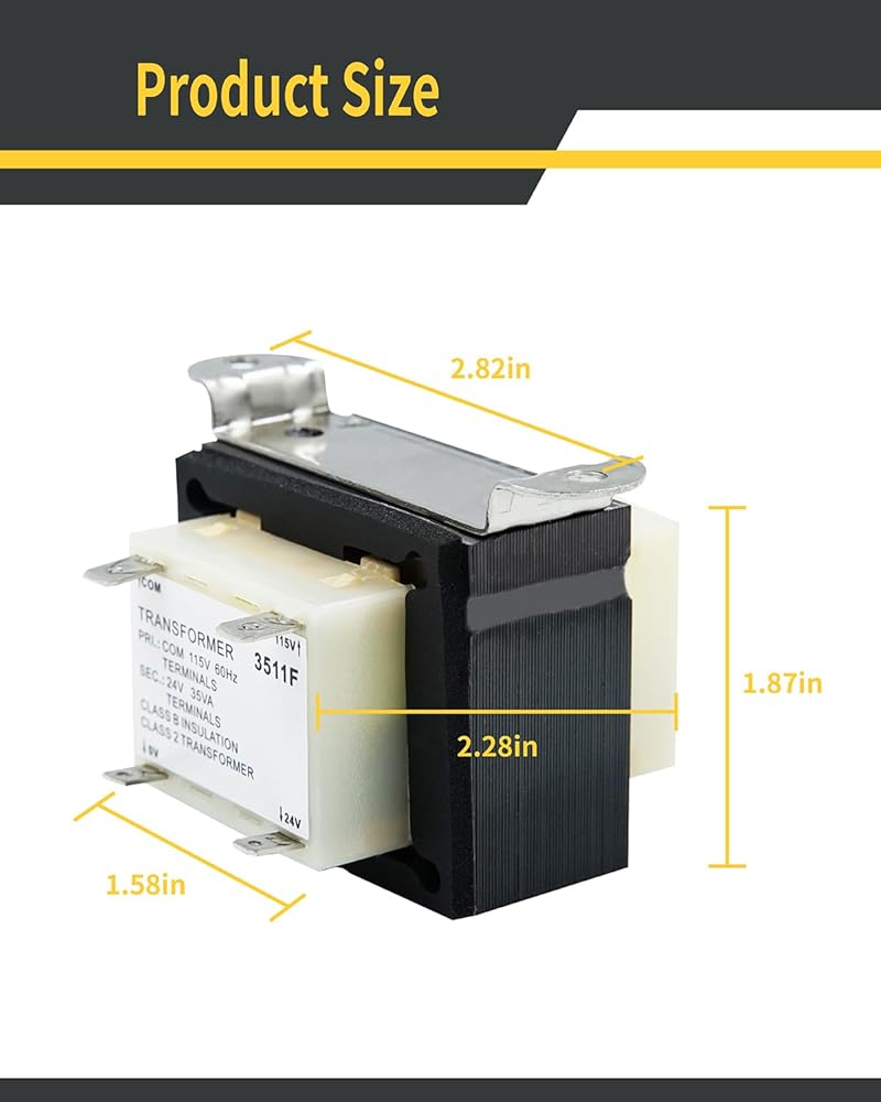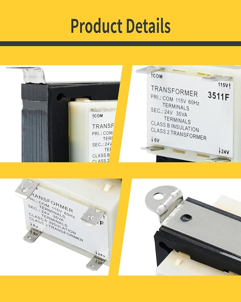 Product Specifications: The furnace transformer has a primary voltage of 115V, a secondary voltage of 24V, a rated power of 35VA, and a frequency of 60Hz