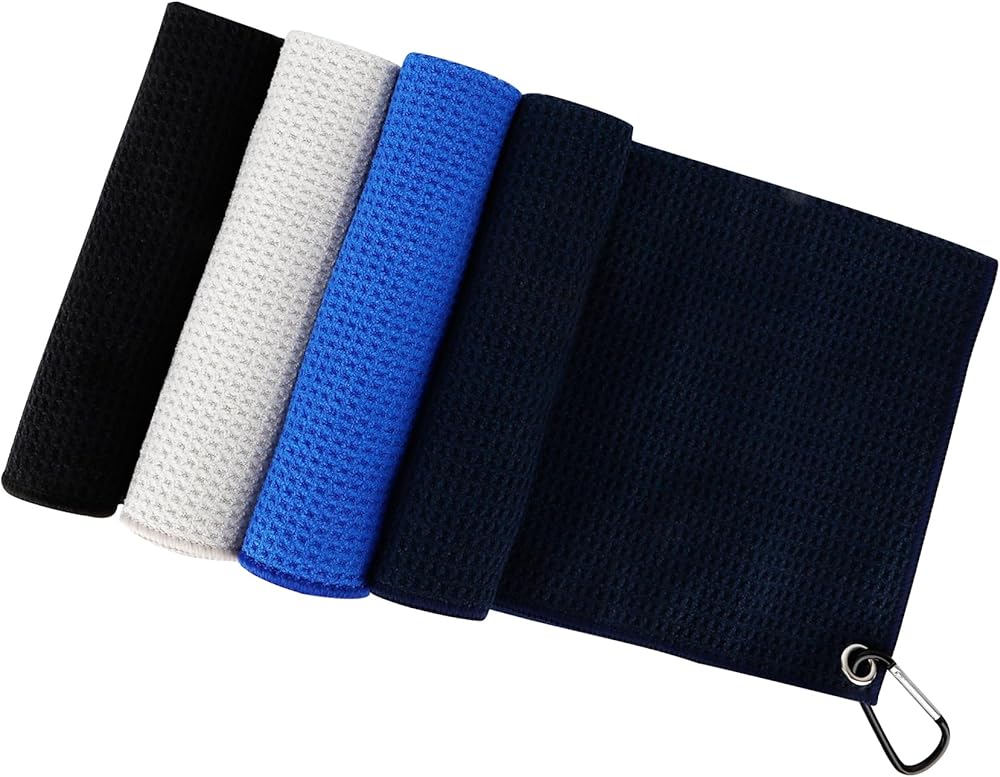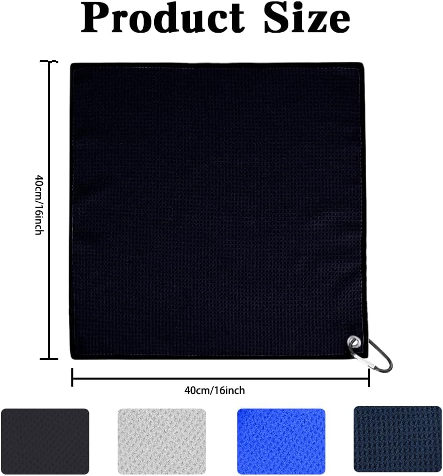 Package: You will receive 4 pcs microfibre golf towels in red, black, grey, royal blue, one for each colour, size is 16" x 16"