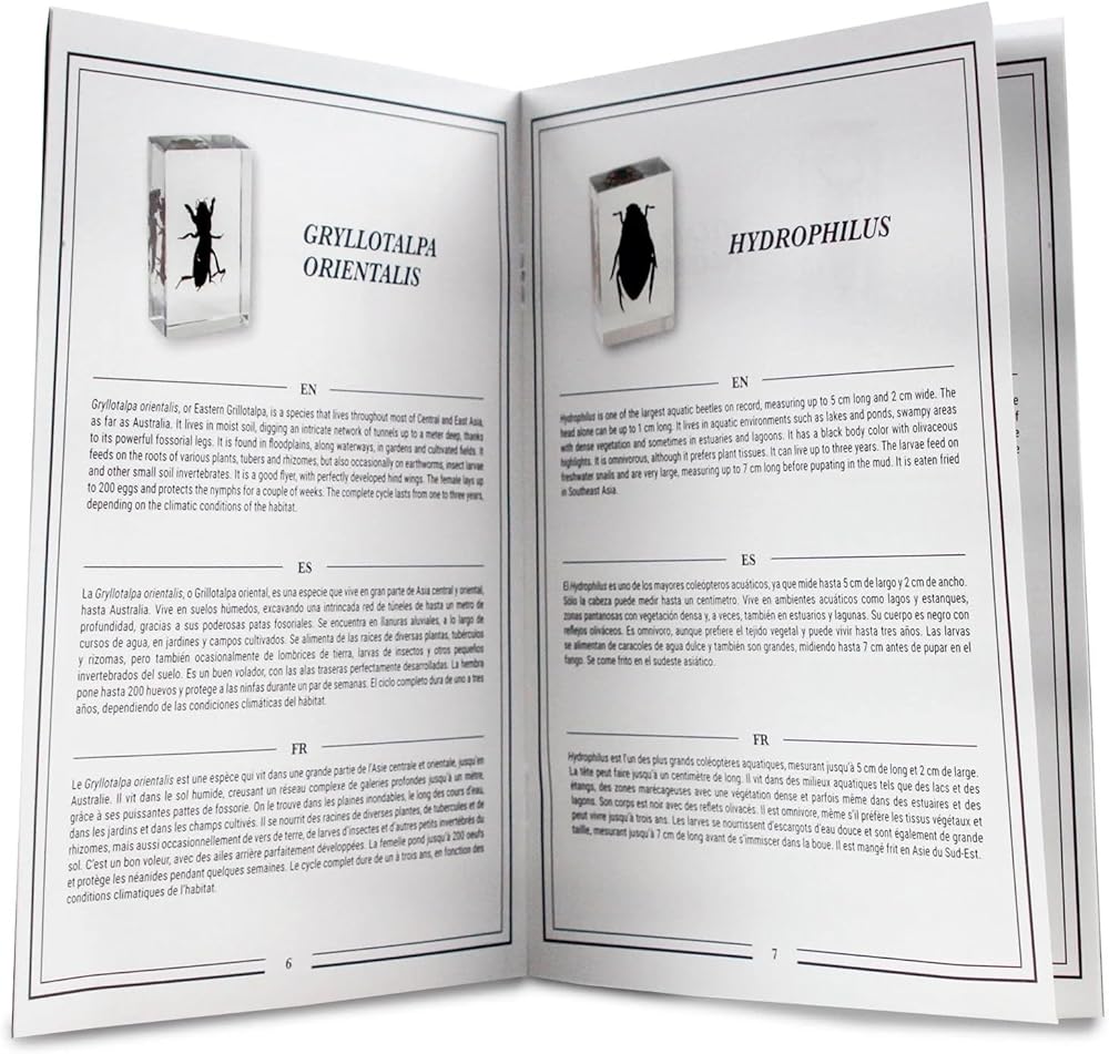 Comprehensive Educational Booklet: Accompanied by an in-depth booklet detailing each specimen, the set offers a rich educational experience and serves as an engaging guide for STEM learners, insect enthusiasts, and collectors.