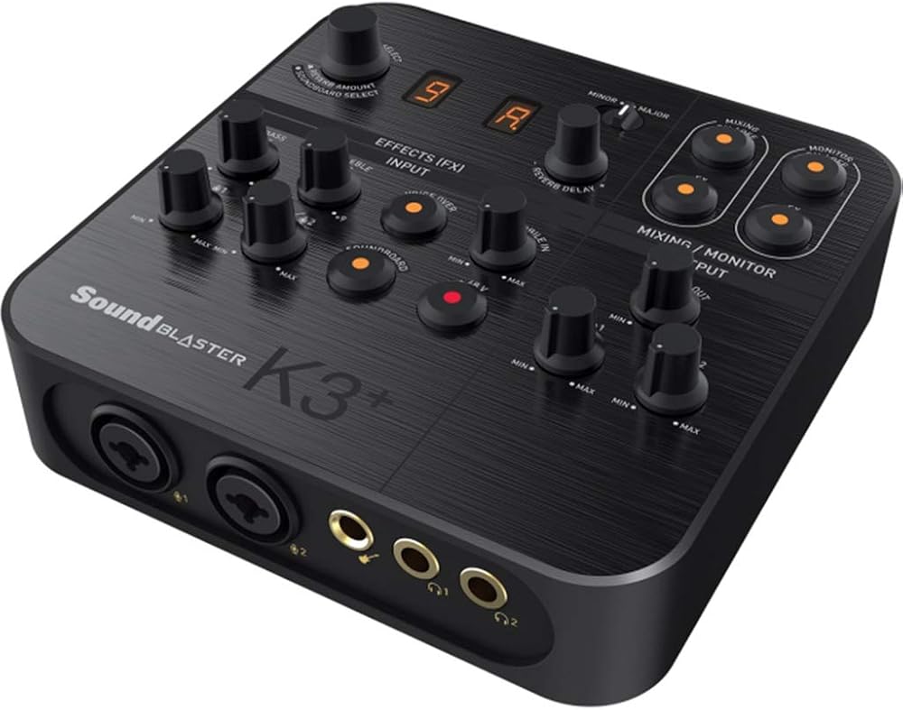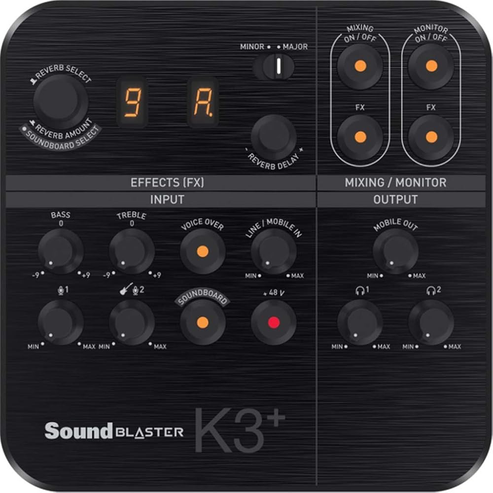 Sound Blaster K3 + is an external sound mixer module with hardware audio processing such as reverb, bass / treble tuning and sound card effects. It has multiple connectivity inputs, supports 48V phantom condenser microphones, and has individual input/output gain control. Convenient and easy to use, the Sound Blaster K3+ is perfect for streamers and musicians. MULTI-PURPOSE ENGRAVING Sound Blaster K3+ supports up to six different usage scenarios, including music playing, recording, broadcasting, web chat, karaoke and DJ hosting. Features such as voice over and reverb effects can be triggered and combined to produce the ideal recording quality needed for your individual use case scenario. PLUG-AND-PLAY CONNECTIVITY FOR PC, MAC, PHONES & TABLETS No driver installation needed, connectivity to PCs and Macs is incredibly simple via USB. The Sound Blaster K3+ can also be connected using a 4 pole, 3.5mm audio jack, providing users with full control when using streaming and recording apps on their smartphones or tablets. Clear recording and playback. Audio quality is the highest priority when recording music or streaming videos. The Sound Blaster K3 + features a built-in high-definition processor that allows you to record crisp, crystal clear audio. Real Time Audio Effects Processing. Sound Blaster K3+ powerful built-in audio processor allows users to access real-time audio effects, including reverb, sound card effects, and bass / treble adjustment. Effects work on PCs and mobile! Combined XLR / TRS inputs and outputs. The K3 + features two XLR / TRS combined inputs that are compatible with most microphones on the market. There is also a built-in microphone amplifier that allows high-quality voice output for live commentary or singing. PHANTOM POWER The K3+ provides 48V PHANTOM POWER to drive condenser microphones for clear and studio-level recording quality. High Impedance Guitar Input Directly connect a guitar with pickup/amplifier or an electric keyboard to get an additional dimension to your performance or live recording. Dual headphone outputs. Sound Blaster K3+ is capable of driving headphones for studio monitoring, and you can connect up to 2 headphones to separately monitor your live presentations. 4-pole mobile input Play directly from your smartphone or tablet and while recording simultaneously! Perfect for Karaoke/Streaming apps like Smule, Belive, and Loops, this feature is supported by the mobile port via a 4-pole auxiliary cable. SYSTEM REQUIRES Intel® Core ™ 2 Duo or AMD® Equivalent Processor (2.8GHz or higher recommended) Intel Motherboard, AMD or 100% Compatible Microsoft® Windows 10 32/64bit, Windows 8.1 / 8.0 32/64bit, Windows 7 32/64bit 1GB RAM USB 2.0 Port / USB 3.0 Mac® OS Mac OS X® 10.9 or above 1GB RAM USB 2.0 Port / USB 3.0