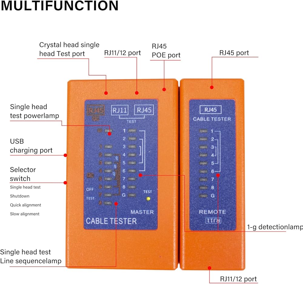 الاكتشاف عن بُعد: يتضمن اختبار كابل Ethernet وحدة رئيسية ووحدة ثانوية. يمكنه اكتشاف كل سلك داخل الكبل ، بما في ذلك 1 ، 2 ، 3 ، 4 ، 5 ، 6 ، 7 ، 8 ، والسلك الأرضي (G) ، وتحديد الدوائر المفتوحة ، والدوائر القصيرة ، والأسلاك غير الصحيحة لضمان سلامة من شبكتك والاتصالات الهاتفية.