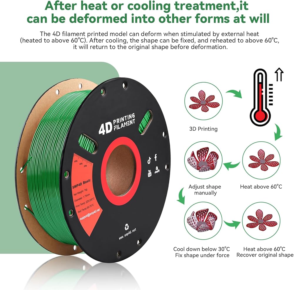 • 【SMP filament(4D filament) Features】The SMP filament(4D filament) made for Shape Memory Polymer Material, The Filament printed model can deform when stimulated by external heat (heated to above 60°C).it can be deformed into other forms at will. After cooling, the shape can be fixed, and reheated to above 60°C, it will return to the original shape before deformation.