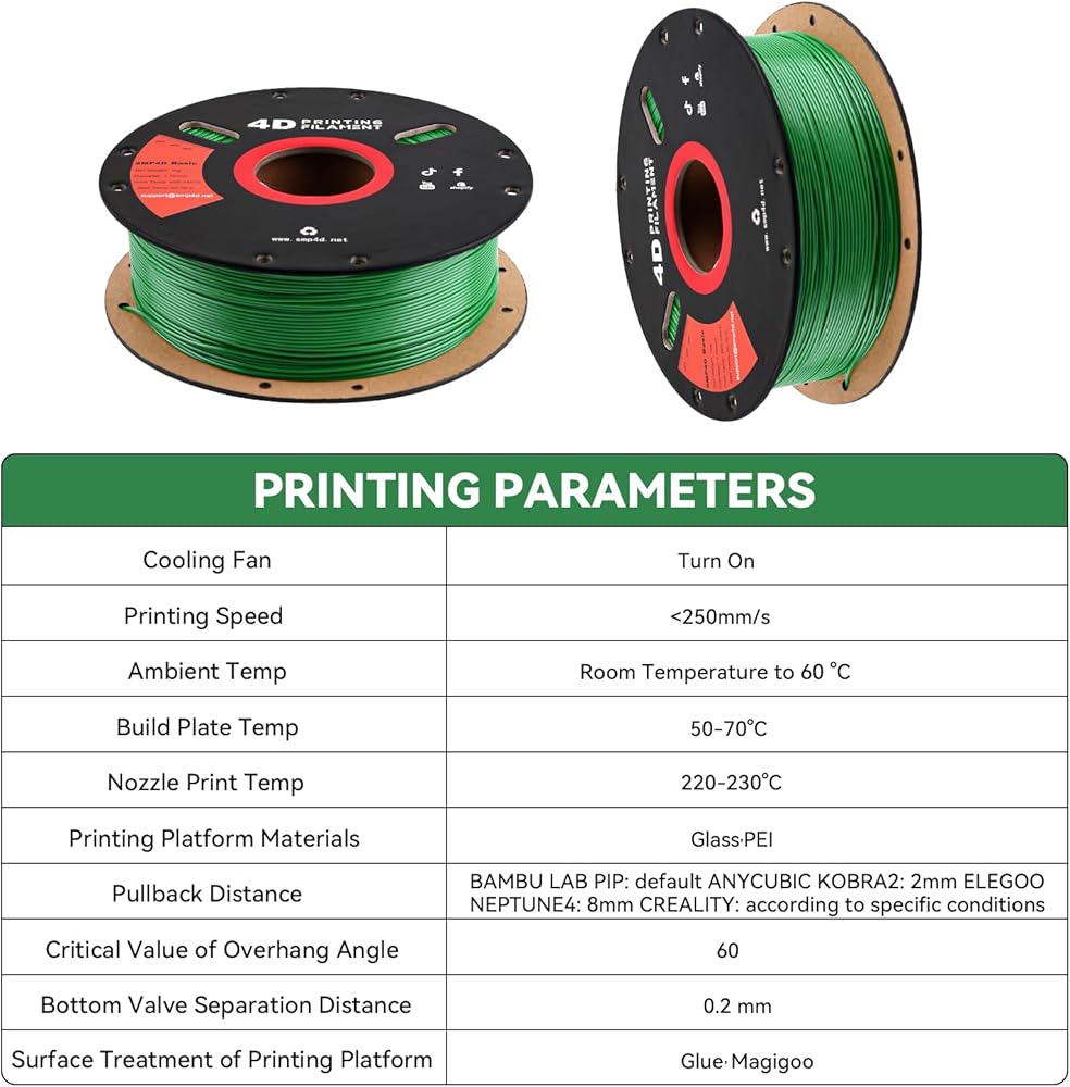 • 【SMP Filament Recommend Settings】We recommend printing at a nozzle temperature of 215-230°C, a bed temperature of 50-70°C, and a printing speed of <250mm/s. fan:Turn On. Foot valve separation distance:0.2mm. Ambient temperature:Room temperature -60℃. Overhang angle critical value:60. Note:Withdrawal distance-Bambu Lab P1P uses default settings, Anycubic Kobra 2 uses 2mm, Elegoo Neptune 4 uses 8mm, and Creality printers can use specific printing settings.