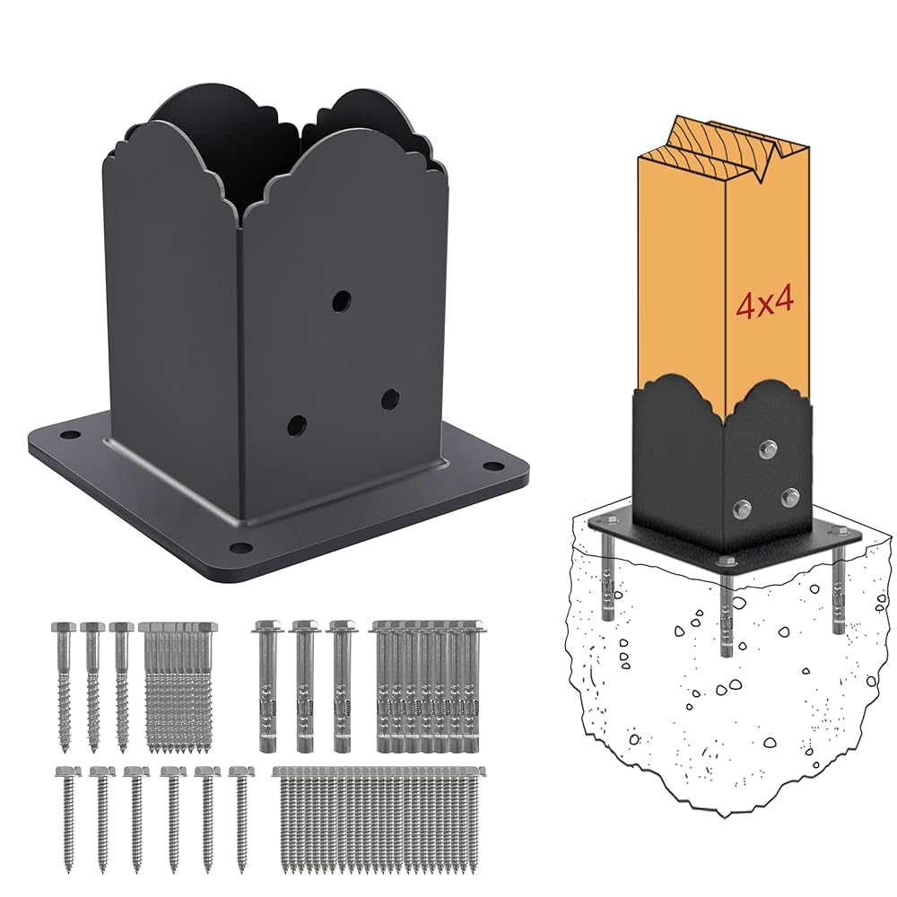 Enhance your outdoor living space with the CHICAURA (4-Pack) 4x4 Post Base, engineered for maximum strength and durability. Each post base features 2mm-thick square steel construction with a robust 4mm base plate, meticulously crafted using precision TIG welding (GTAW) for unparalleled stability. The fully encapsulated design ensures long-lasting support, making it ideal for pergolas, fences, decks, and porch railings. The black powder-coated finish not only adds an elegant touch but also provides superior rust protection, ensuring your outdoor structures remain strong and beautiful through all seasons. With this heavy-duty post bracket, you can confidently build or renovate your outdoor spaces knowing that every component is built to last. Each CHICAURA 4x4 Post Base includes all necessary high-quality 304 stainless steel fasteners—4 screws for wooden decks, 4 anchor bolts for concrete floors, and 6 wood post screws—ensuring a seamless and long-lasting installation without the need for additional purchases. Designed with three screw holes per side for secure mounting and four drainage holes at the bottom to prevent water buildup, these post anchors guarantee stability while preventing rust and rot. The stylish pattern of the post base combines functionality with aesthetics, adding a decorative element to any outdoor project. Whether you're building a pergola, gazebo, fence, handrail, deck railing, or mailbox, CHICAURA's 4x4 Post Base offers reliable support and a touch of elegance, enhancing both the appearance and durability of your outdoor structures.
