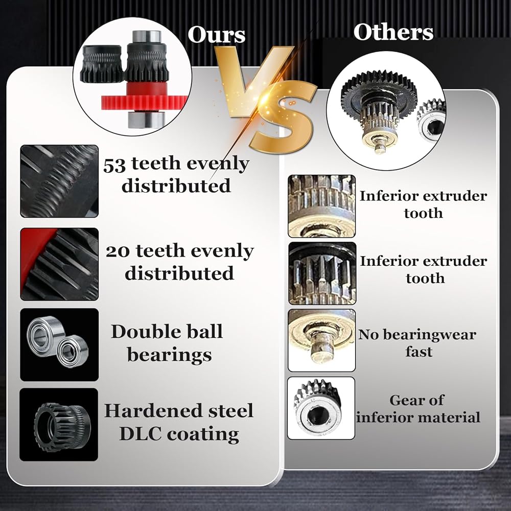 Selected materials, excellent quality:made of high quality POM and mold steel, CNC machined. Filament drive gears are made of mold steel instead of the common hardened steel material. The pressure resistance reaches HRC 60+. And the surface hardness HV value is as high as 1000-1200, which greatly ensures the gear's strength, abrasion resistance and corrosion resistance, improves the load carrying capacity and prolongs the service life.