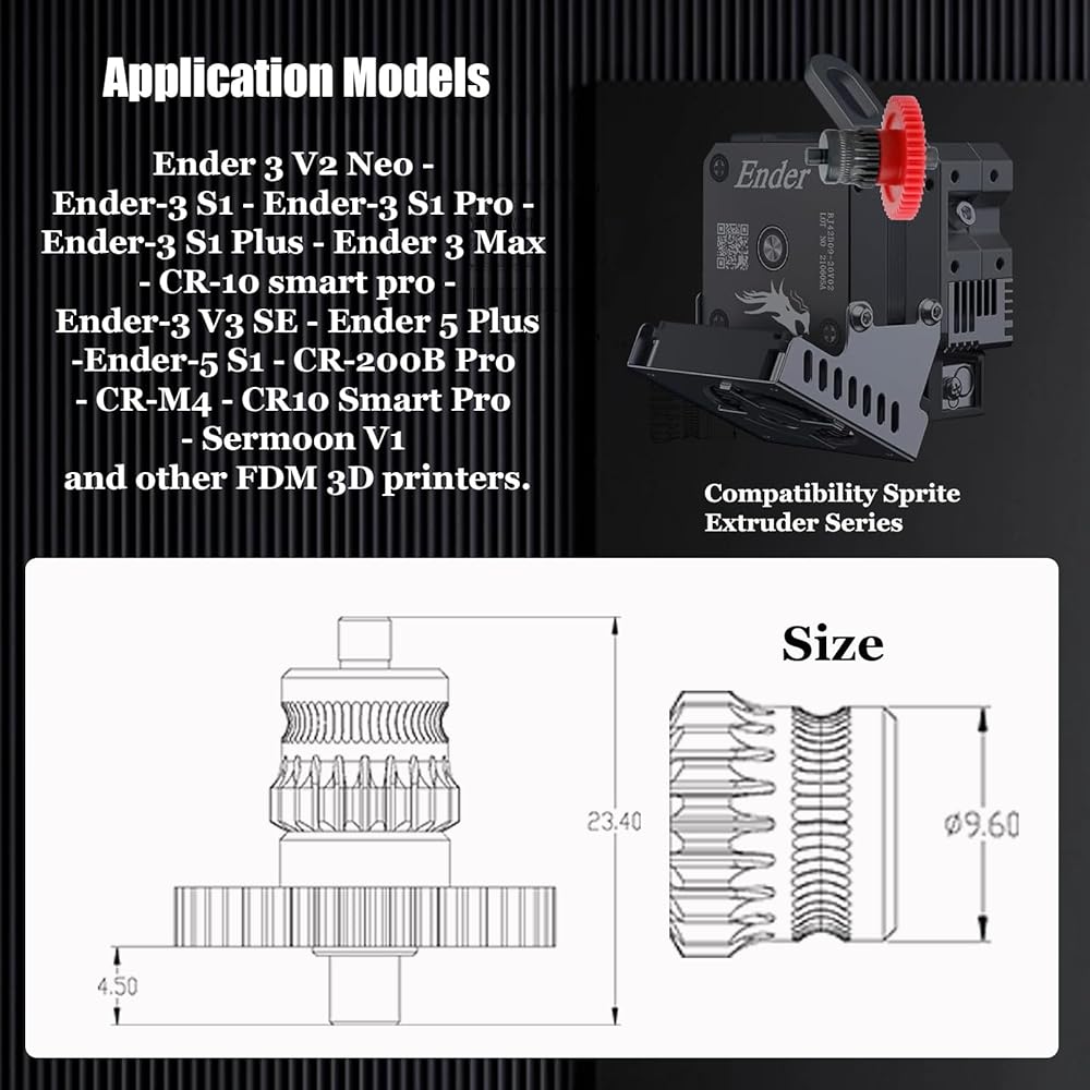 Wide compatibility: compatible with multiple popular FDM 3D printers, designed specifically for with CREATY Sprite Extruder Application Models such as Ender 3 V2 Neo/Ender-3 S1/Ender-3 S1 Pro/Ender-3 S1 Plus /Ender 3 Max/CR-10 smart pro/ Ender-3 V3 SE/Ender 5 Plus/Ender-5 S1/CR-200B Pro/CR-M4/CR10 Smart Pro/Sermoon V1, upgrading your 3D printing experience.
