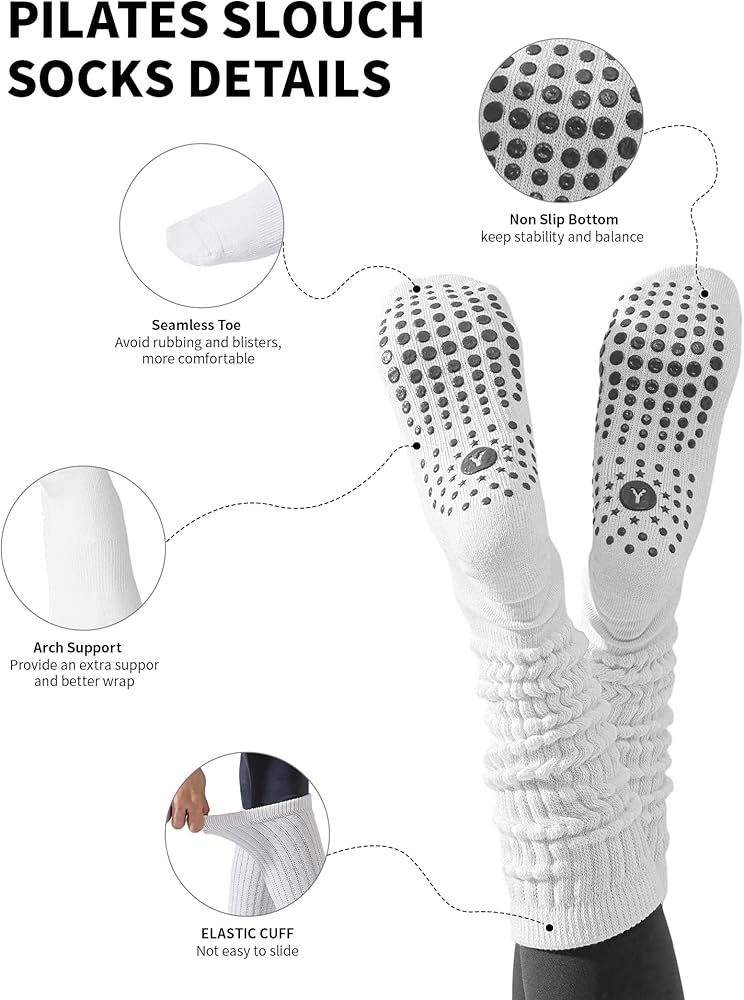 Slouchy Grip Socks with Arch Support:- - - The slipper socks for women combine trendy style with practical performance. The adjustable length allows you to scrunch them down or pull them up for a chic look. Designed with precise arch compression, these cute socks stay in place during workouts, providing optimal support. The cushioned sole adds comfort, reducing impact while keeping your feet warm. The sticky socks are also perfect for pairing with shorts, skirts, or boots for daily outfits.