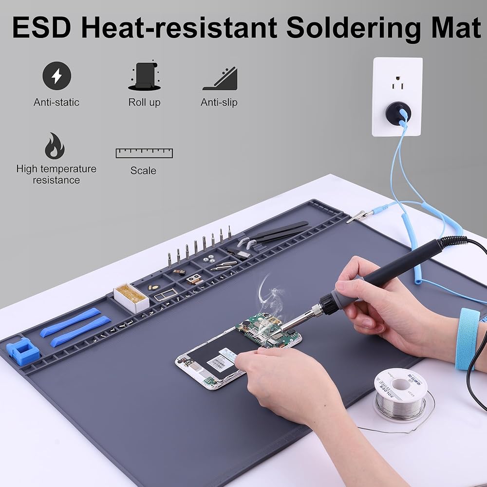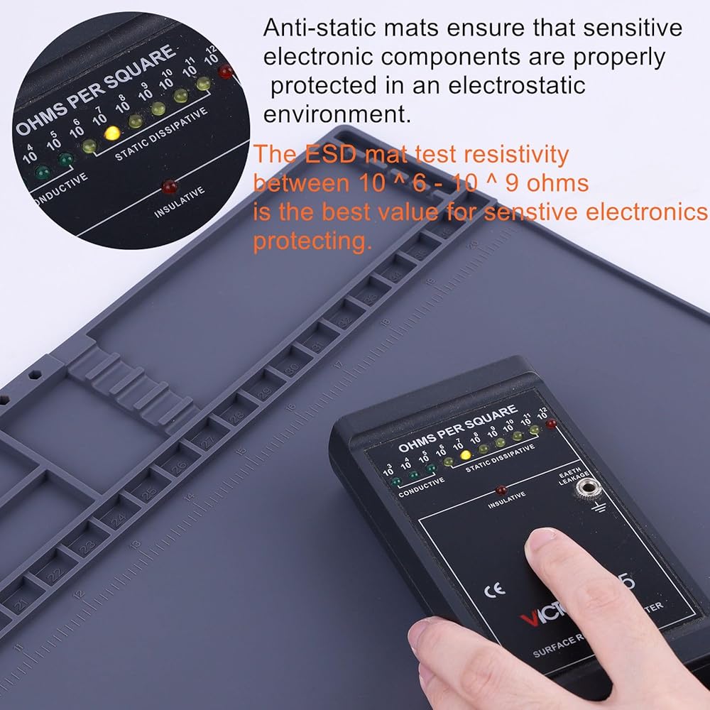 🥇【 ESD آمن للإلكترونيات】- هذه حصيرة عالية الجودة مضادة للاكتئاب والتي صممت سطح عمل أكثر أمانًا وأفضل لتجميع وإصلاح أو لحام حساسية ثابتة. مقاومة السطح لـ HPFIX المضادة للثني IS10^6 - 10^9 أوم والتي توفر أفضل حماية للمكونات الحساسة من تلف ثابت. إنها حصيرة عمل أساسية مضادة للضادة في الإصلاح.