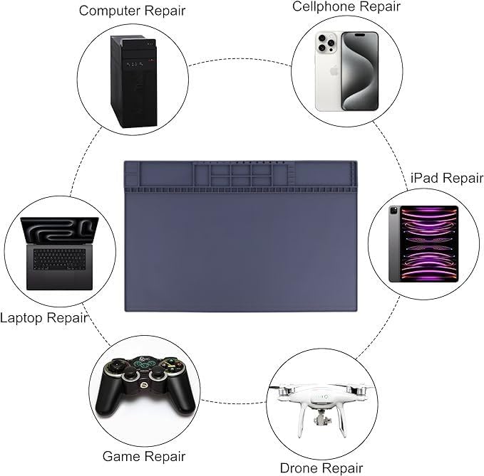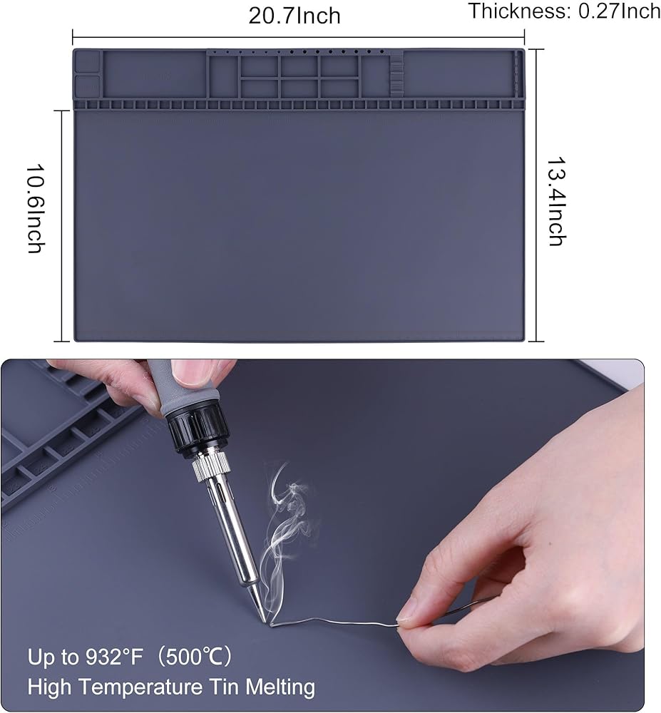 "الحجم الكبير الفائق ومقاوم الحرارة العالية】- حصيرة لحام مضادة للذات مع حجم كبير 20.7 '× 13.4' ، منطقة العمل 20.5 'x 10.6' ، وخاصة لحام وإصلاح العناصر الكبيرة ، مثل اللوحات الأم للكمبيوتر وأجهزة الكمبيوتر المحمولة وأجهزة iPad والكاميرات وغيرها من المنتجات الإلكترونية بأحجام مختلفة. في هذه الأثناء ، تحمل هذه الحصيرة المضادة للثبات درجات حرارة عالية 932 درجة فهرنهايت (500 درجة مئوية) ، والتي يمكن أن تحمي منضدة عملك من الاحتراق والدمار. بالمقارنة مع مواد مطاطية ESD MAT ، فإنه يحتوي على مقاومة حرارة أفضل عند درجة حرارة عالية.