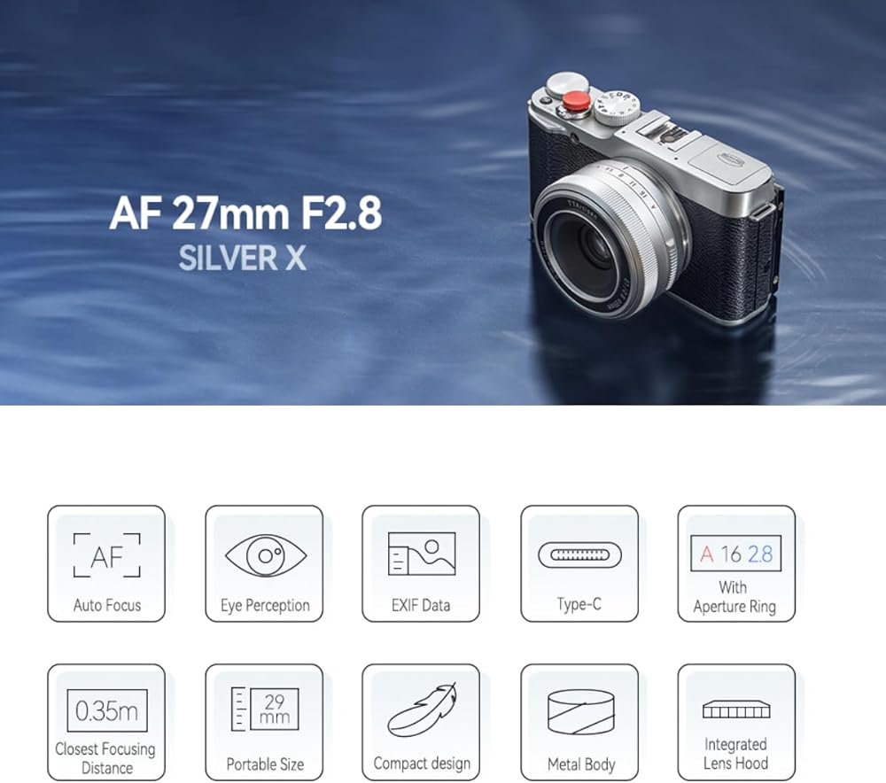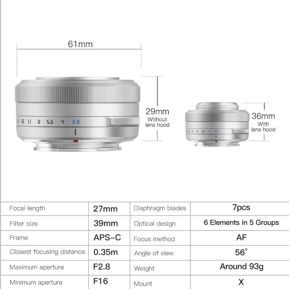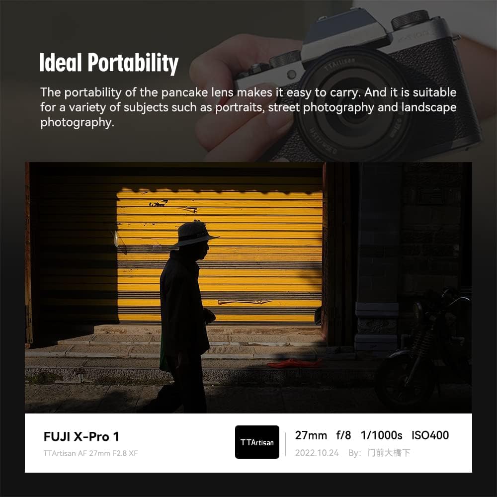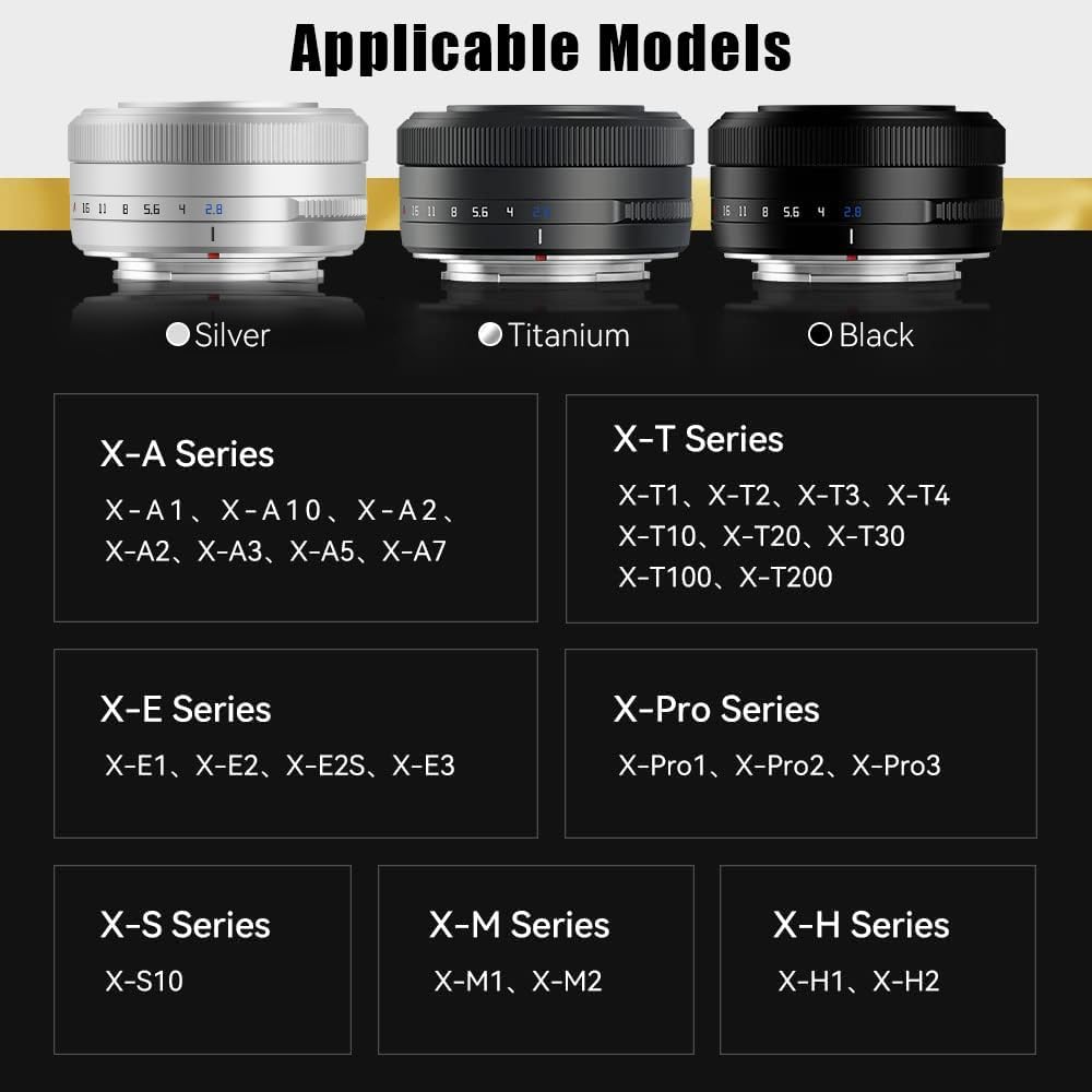 • عدسة Prime Compact APS-C: تعد Ttartisan 27mm F2.8 عدسة أولية خفيفة الوزن ومحمولة مصممة لكاميرات Fujifilm X-Mount APS-C Lirrorless ، مما يوفر طولًا بؤريًا مكافئًا 41 مم وأقصى فتحة F/2.8.