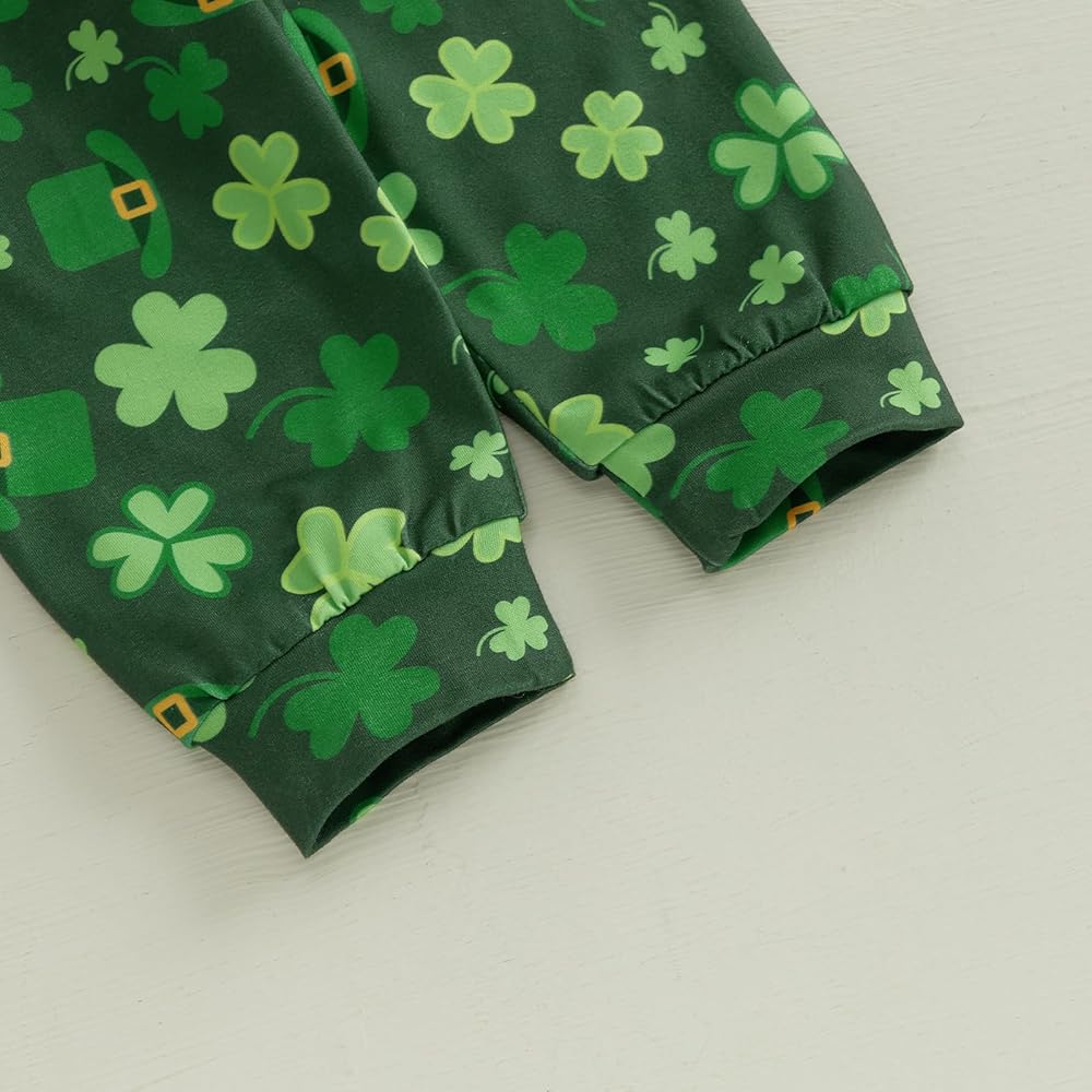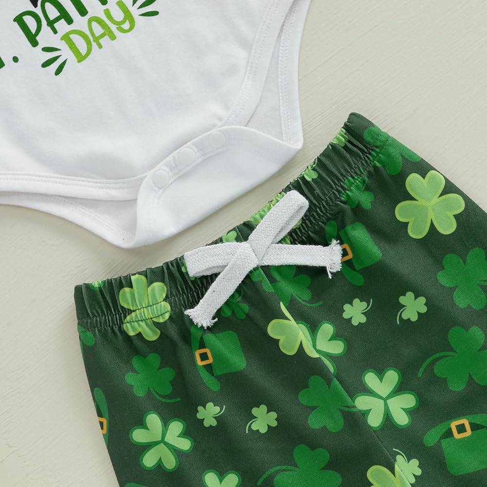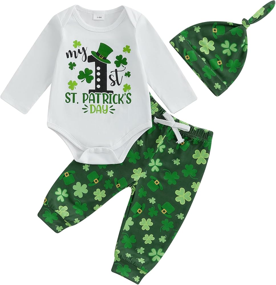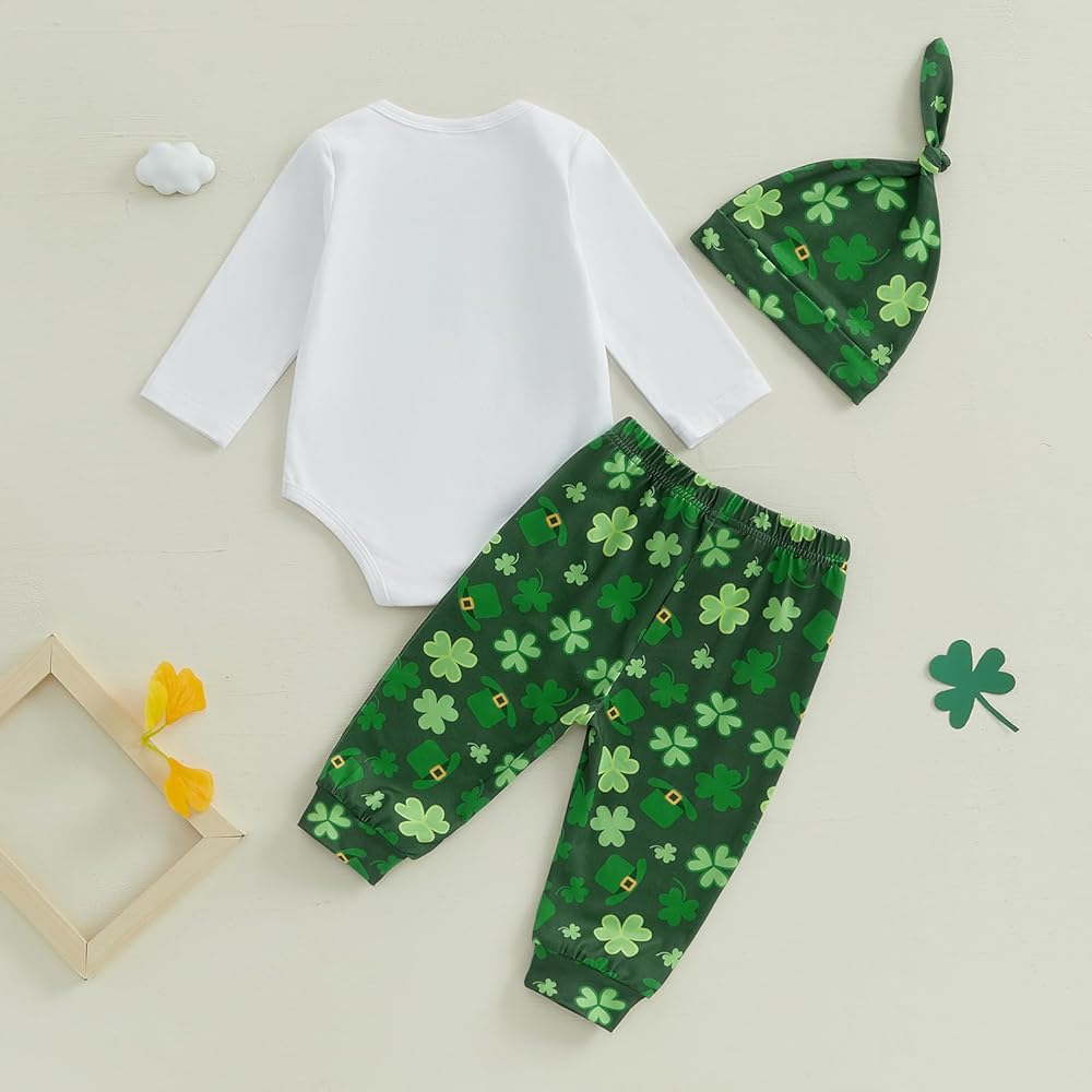 Baby Boy Irish Outfits Letter Long Sleeve Romper with Elastic Waist Shamrock Pants Hat 3 Pcs Outfit