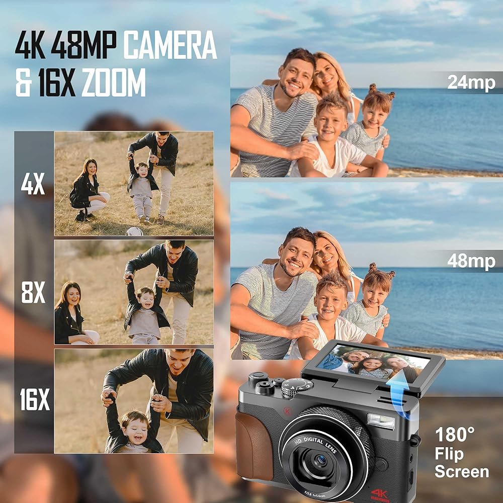 الكاميرات الرقمية للتصوير الفوتوغرافي ، 4K و 48MP و 16x فيديو/مدونة مدونة من أجل YouTube ، كاميرا السفر مع بطاقة TF 32 جيجابايت وبطاريتين ، كاميرا مضغوطة ، اختيار هدية رائعة ، نقطة رقمية وتصوير الكاميرا