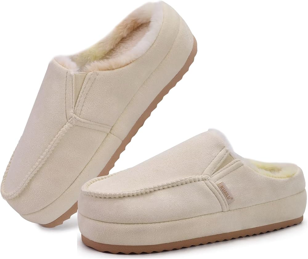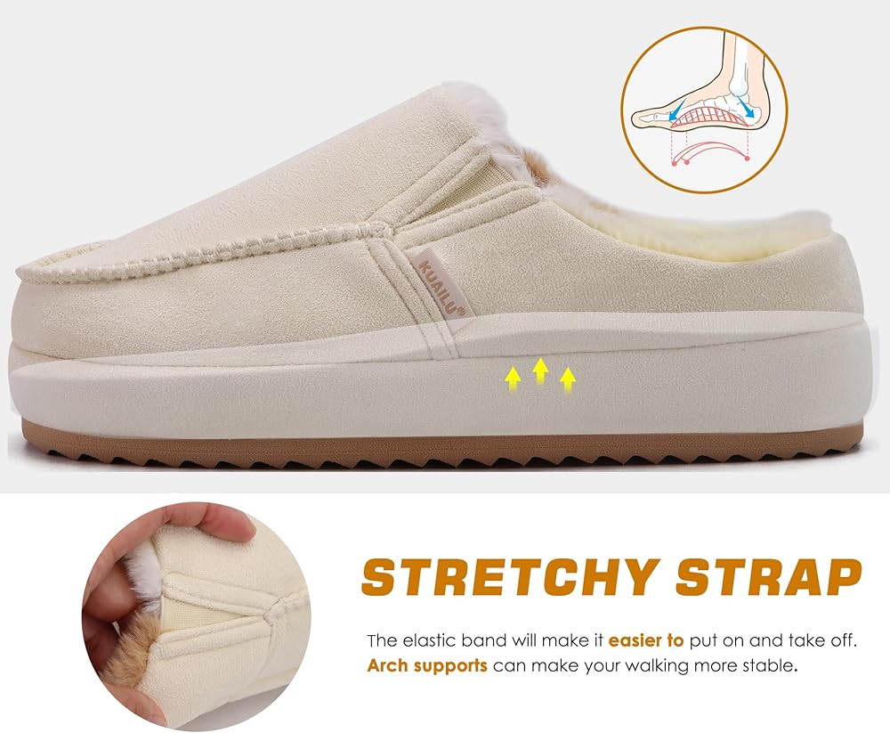 Kuailu Womens Clog slippers دافئ من جلد الغزال الدافئ الدافئ قوس الدعم الدعم فو فرو هاوس السيدات غرفة نوم غرفة نوم مريحة الذاكرة العظمية الرغوية التهاب اللفافة الوطن المنزل في الهواء الطلق أحذية بيج US7
