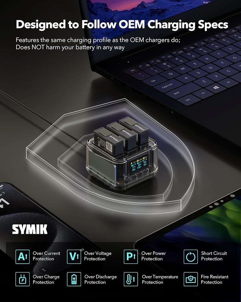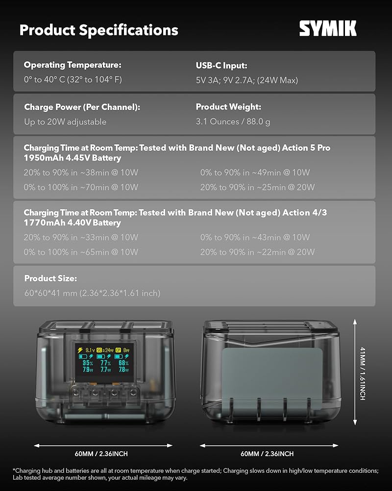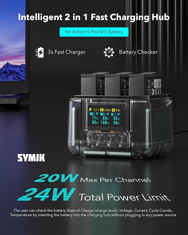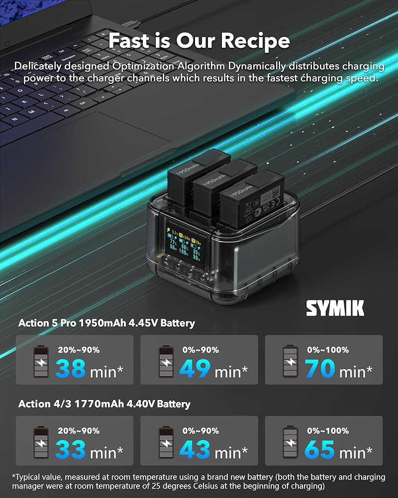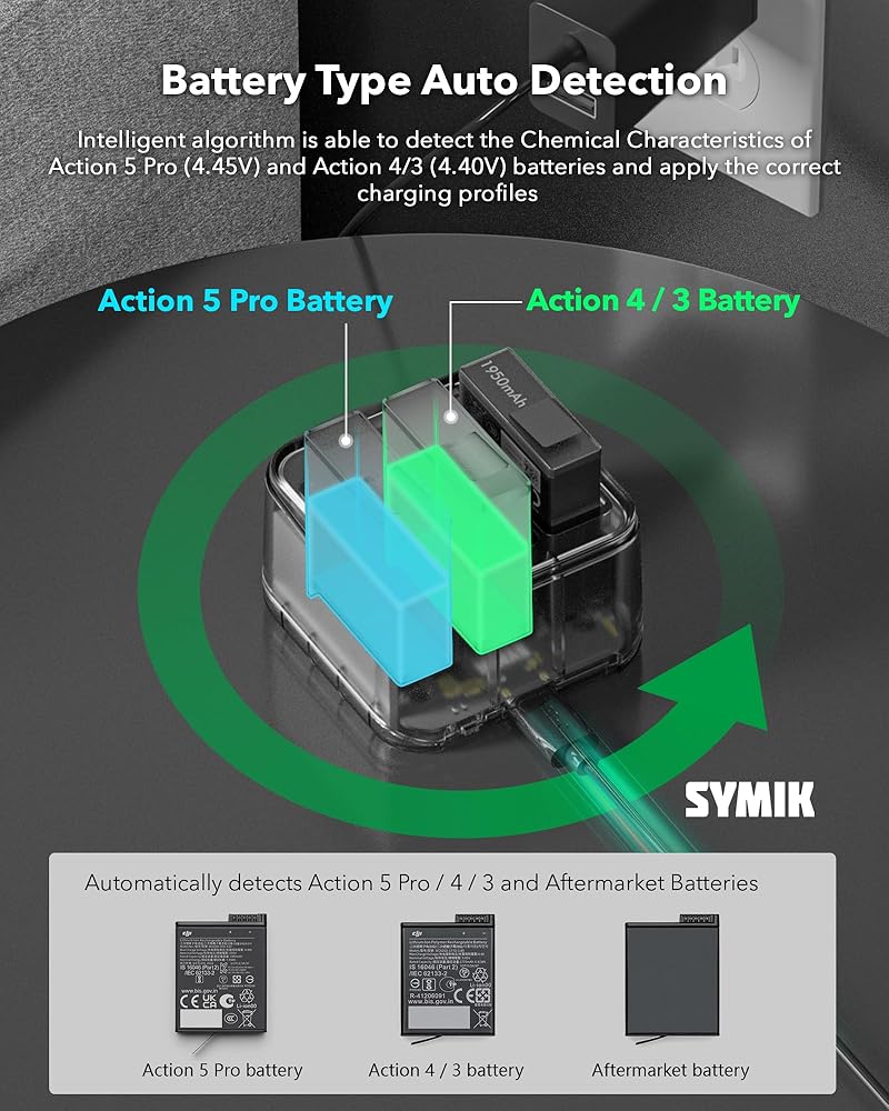 توافق ممتاز: شاحن البطارية السريع Symik مصمم خصيصًا لـ DJI Osmo Action 5 Pro ، Osmo Action 4 ، Osmo Action 3