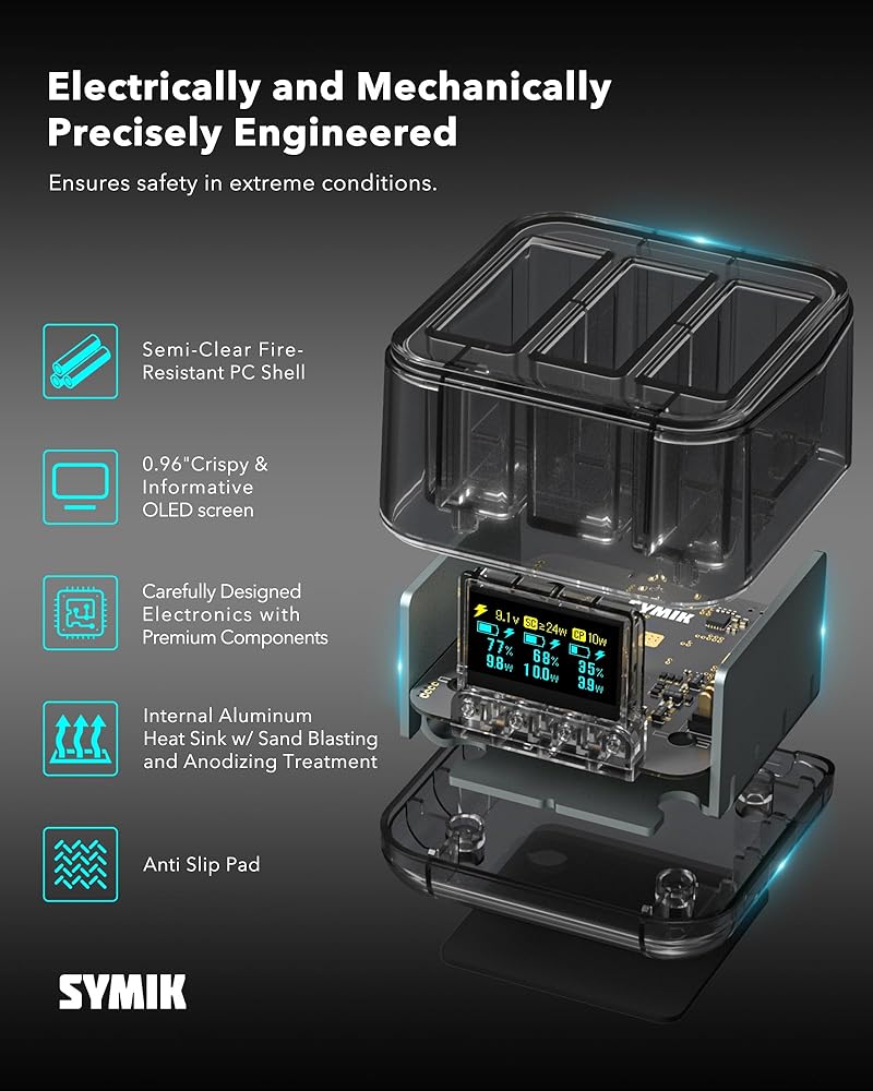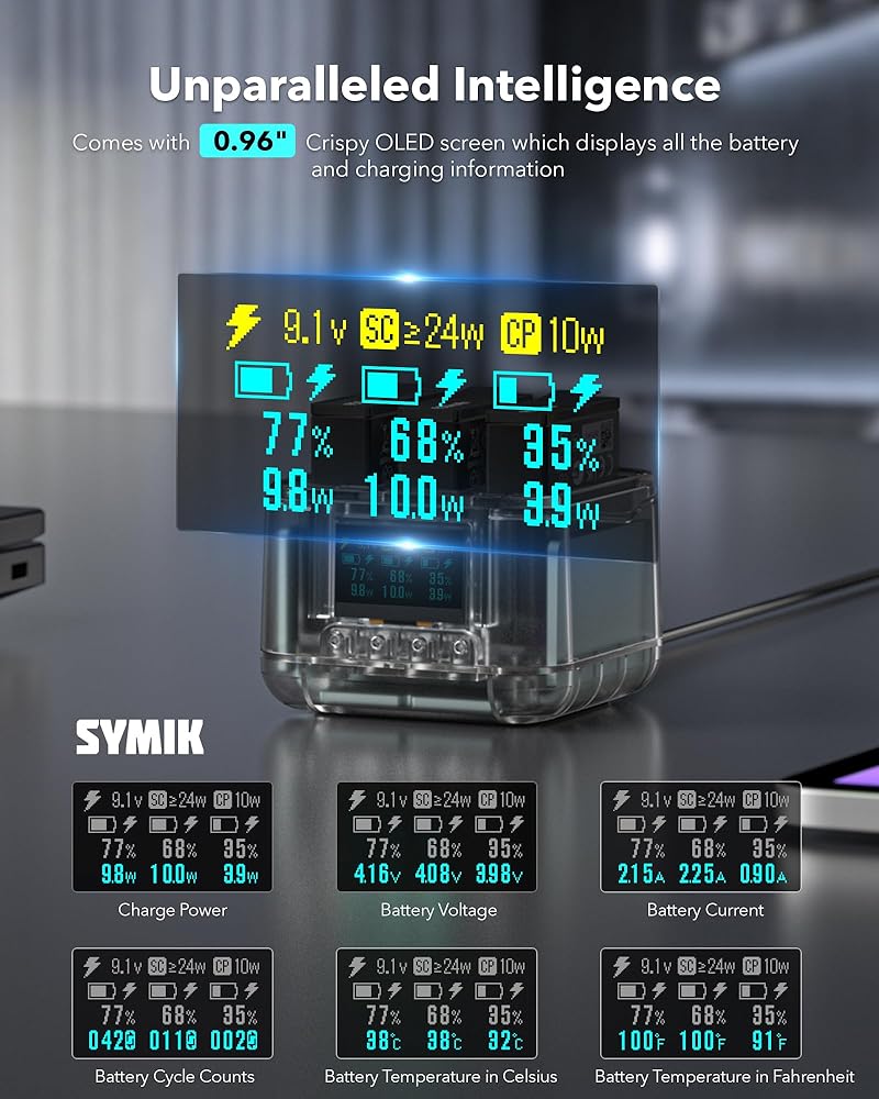 شاحن بطارية Symik لـ DJI Osmo Action 5 Pro ، 24W OLED Screen Charger Charger Triple Slot Fast Charge Hub لـ DJI Action 5 Pro 4 3 ، يظهر مستوى البطارية (الشاحن فقط)
