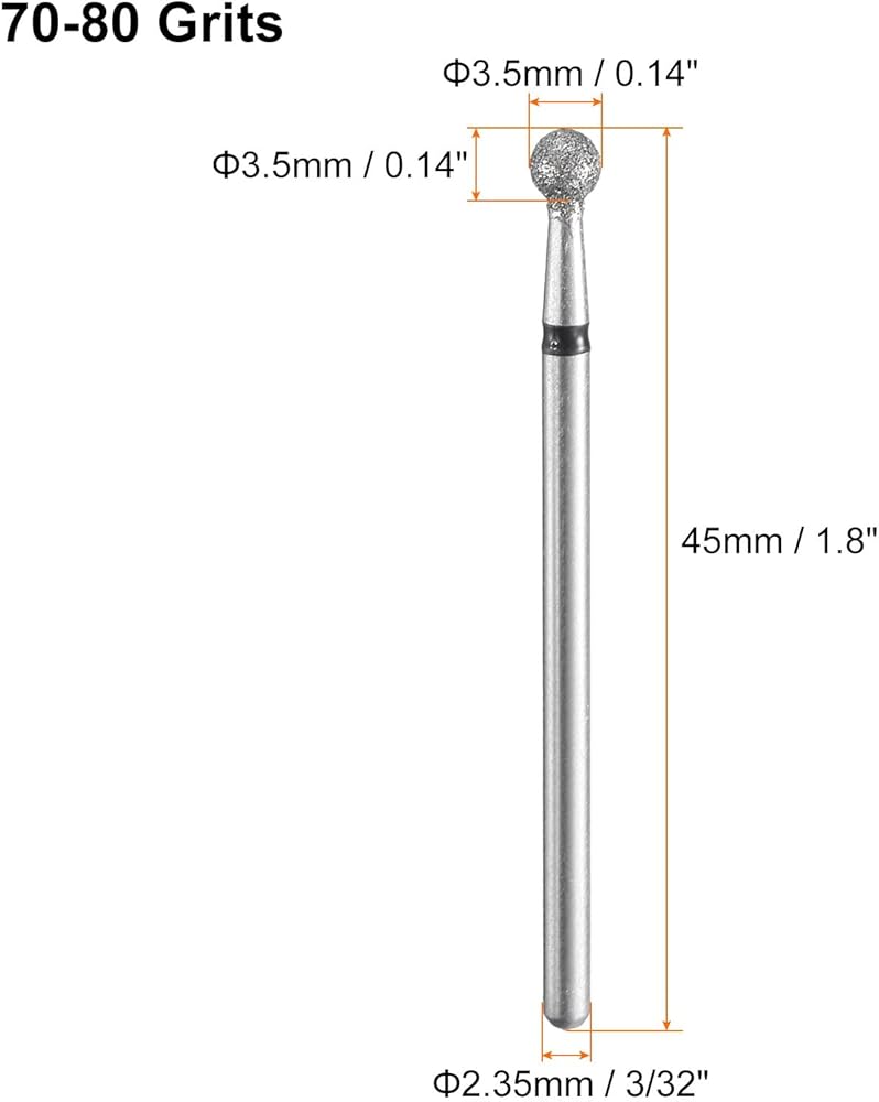 Size - Grits: 200-230 Grits; Diameter: 4.5mm / 0.18"; Head Length: 4.5mm / 0.18"; Shank Diameter: 2.35mm / 3/32"; Shank Length: 41mm / 1.61"; Total Length: 45mm / 1.8"; The multi-purpose tool diamond drill bit set is packaged in a sturdy plastic box for your convenience to carry and store