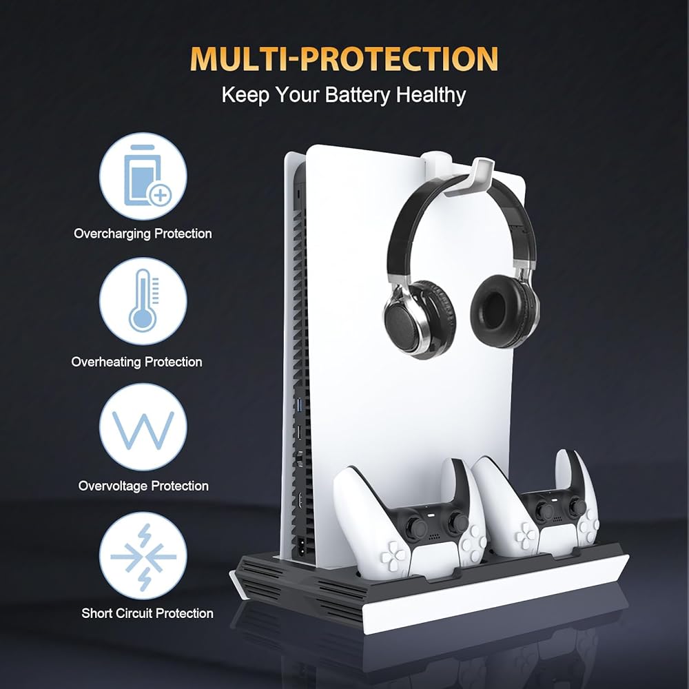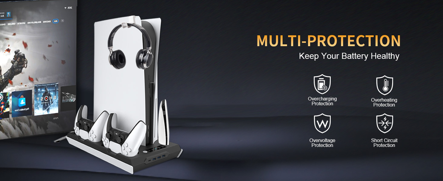 حماية شحن آمنة: تتضمن محطة شحن PS5 الشحن الزائد ، الجهد الزائد ، وميزات حماية الدائرة القصيرة ، وتتوقف تلقائيًا بنسبة 70 ٪ لتمديد عمر بطارية وحدة التحكم. تم تصميم محطة الإرساء PS5 لتقليل التآكل على منافذ الشحن ، مما يضمن المتانة على المدى الطويل.