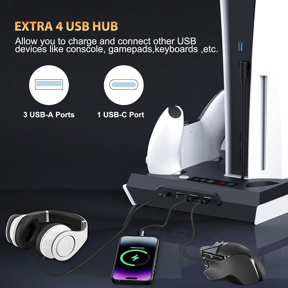 محطة التبريد النحيفة PS5/ PS5 مع محطة شحن وحدة تحكم مزدوجة ، حامل تبريد PS5 للحصول على وحدة تحكم PlayStation 5 ، حامل سماعات الرأس/ مروحة التبريد PS5/ 4 USB محور كل شيء في منظم إكسسوارات واحد ، أسود