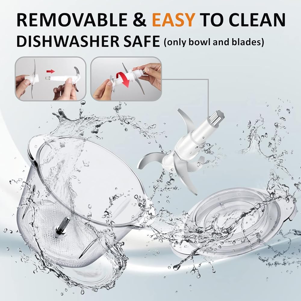 【المزيد من القوة للقطع بالتساوي】 مقارنة بخلاط معالج 3-برالدي ، يتبنى معالج الطعام لدينا محركًا أكثر قوة و 4 شفرات متقاطعة حادة للمساعدة في تحقيق معالجة أفضل للأغذية تؤدي إلى وقت أقل. السرعة أنا لمعالجة الأطعمة الناعمة مثل البصل والفلفل الحار والسرعة الثانية للأطعمة الصلبة مثل اللحوم والجزرة.