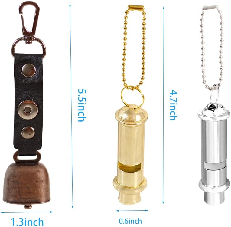 • 𝗣𝗿𝗼𝗱𝘂𝗰𝘁 𝗗𝗶𝗺𝗲𝗻𝘀𝗶𝗼𝗻𝘀: Bear bell measures 5.5” x 1.3” x 0.8”. Whistle measures 4.7” x 0.6” x 0.6”. Bells and whistles are made of metal and leather. Compact and lightweight, ideal for carrying during hikes.