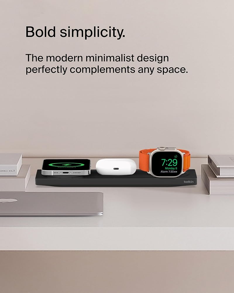 اتصال مغناطيسي قوي: يستخدم حامل الشاحن اللاسلكي من بيلكن تقنية ماج سيف لضمان المحاذاة المثالية. حتى مع يد واحدة، يسمح لك النظام المغناطيسي المدمج بوضع الايفون الخاص بك بسهولة على حامل الشحن دون أي متاعب.