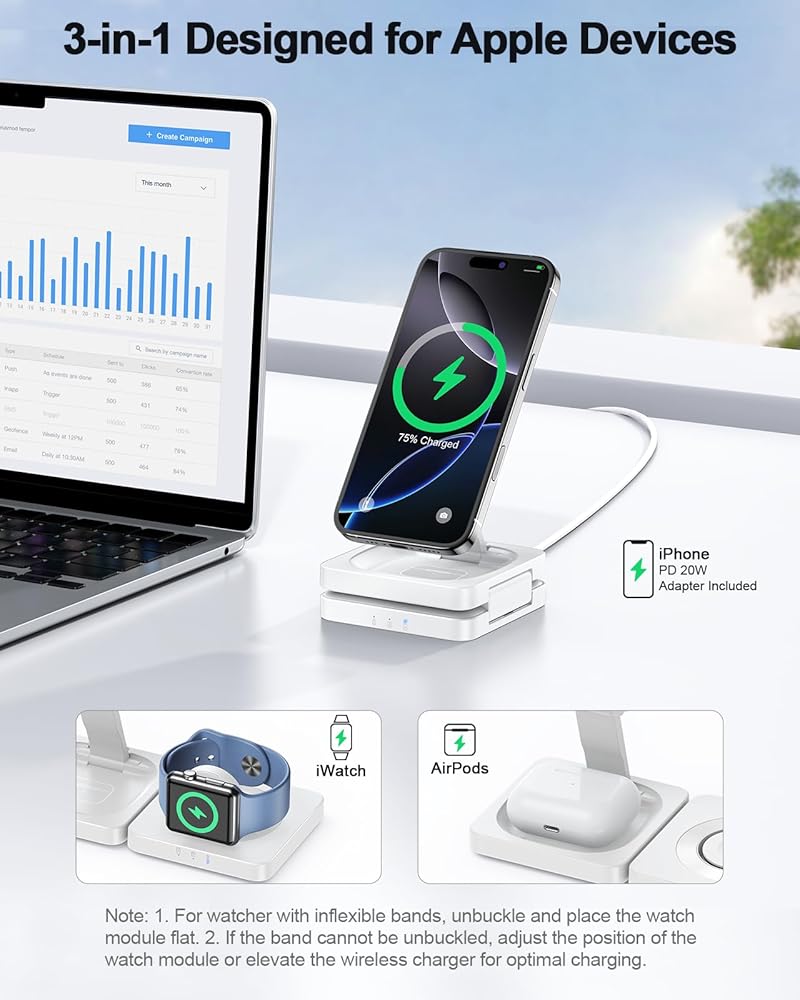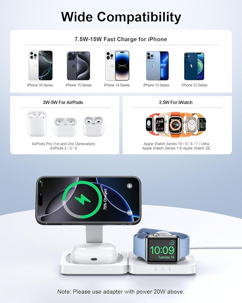 • 3 في 1 محطة شاحن قابلة للطي: تستخدم محطة شحن 2025 جديدة في عام 2025 في 1 لطي لأجهزة Apple ملفًا جديدًا لسبائك النحاس الذي يمكن أن يزيد من معدل تحويل الطاقة بنسبة 50 ٪. يمكن لمحطة شحن Apple شحن ما يصل إلى 3 أجهزة في نفس الوقت ، مع وجود قوة شحن أقصى قدرها 15W كحد أقصى لـ iPhone و 5W Max لـ AirPods و 2.5W لـ IWATCH. متوافق مع سلسلة iPhone 16/15/14/13/12 ، Apple Watch 10 9 8 7 6 5 4 3 2 Ultra 2 1 ، AirPods Pro/4/3/2. متوافق أيضًا مع المزيد من أجهزة الهاتف اللاسلكية الشحن.