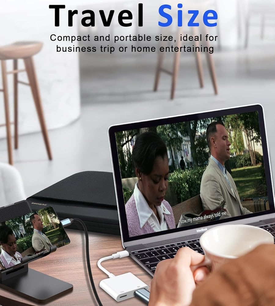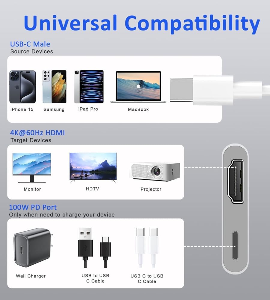 Charging While Playing: Included a 100W USB-C PD charging port, allows you to charge your cellphone/laptop while watching images/videos from them, keep your output c port devices at full power all the time with this iphone 15 usb c to hdmi adapter for tv.