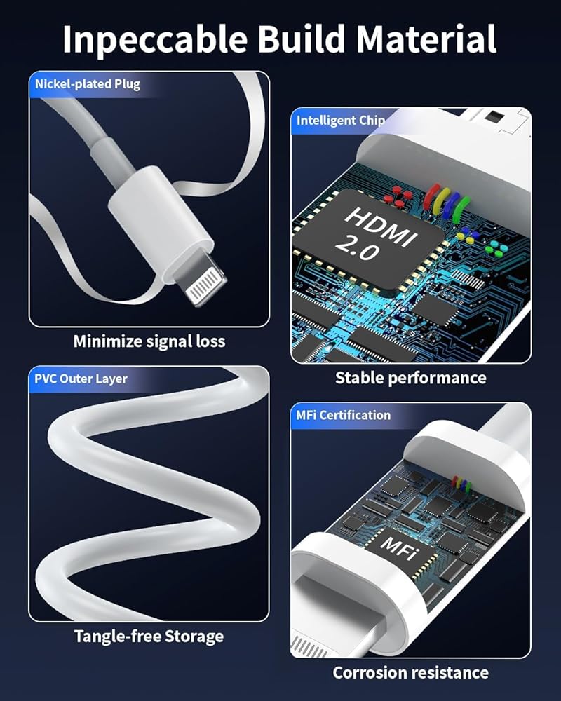 • Connect your iPhone to hdmi cable with TV directly no need extra HDMI Cable, it is the perfect solution for seamless connectivity between your iPhone and TV, projector, or monitor. With a 6.6ft length, durable construction, and compatibility with the latest iPhone models, you can enjoy crystal-clear audio and high-definition video with ease