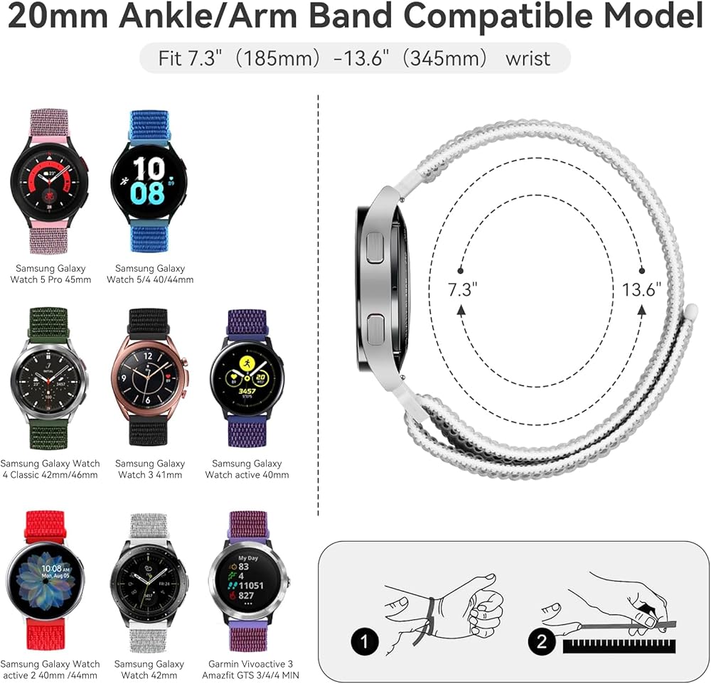 Compatible Models: The 20mm Sport Ankle/Arm Bands is compatible with Samsung Galaxy Watch 7/6 40mm 44mm,Samsung Galaxy Watch 5 40mm 44mm,Galaxy Watch 5 Pro 45mm, Galaxy Watch 4 40mm 44mm, Galaxy Watch 4&6 Classic, Galaxy Watch 3 41mm, Galaxy Watch Active 2, Galaxy Watch Active, Samsung Galaxy Watch 42mm, Galaxy Gear Sport, Galaxy Gear S2 Classic. Also fit for smartwatch with 20mm band lug width, for example Garmin Vivoactive 3, Garmin Venu Sq. But NOT suitable for Garmin Venu 3 plus