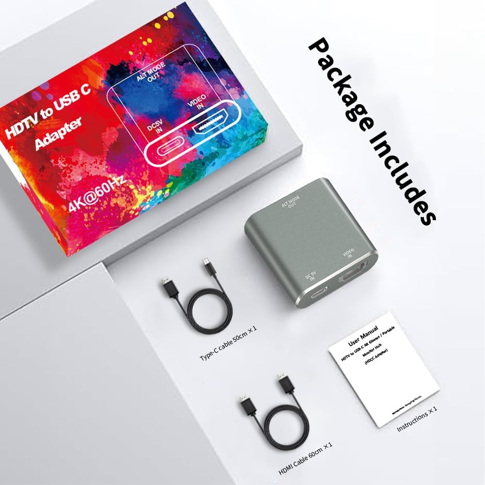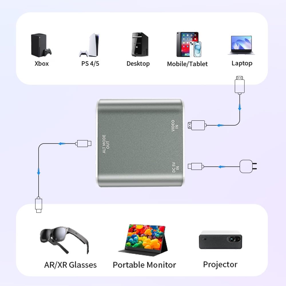 يجب أن تحتوي أجهزة الفيديو على واجهة HDMI: هذا المحور هو فقط لنقل مصدر HDMI أحادي الاتجاه إلى نظارات أو عروض SMART USB-C / TYPE-C. إنه غير مناسب لهواتف USB-C أو أجهزة الكمبيوتر المحمولة USB-C.
